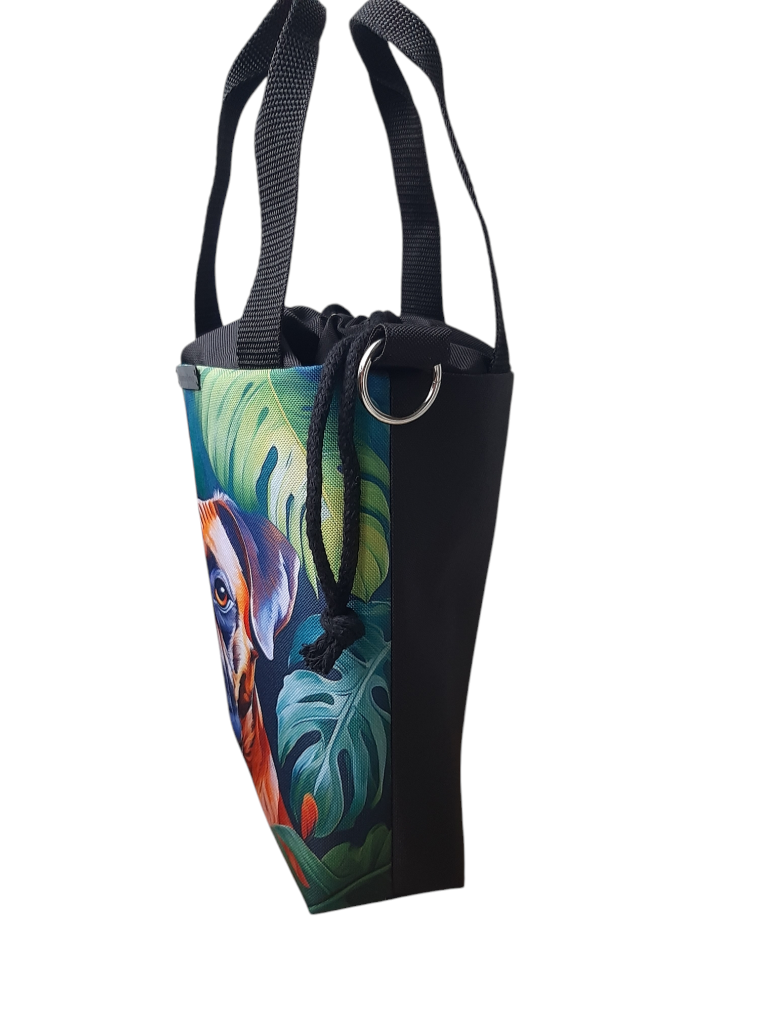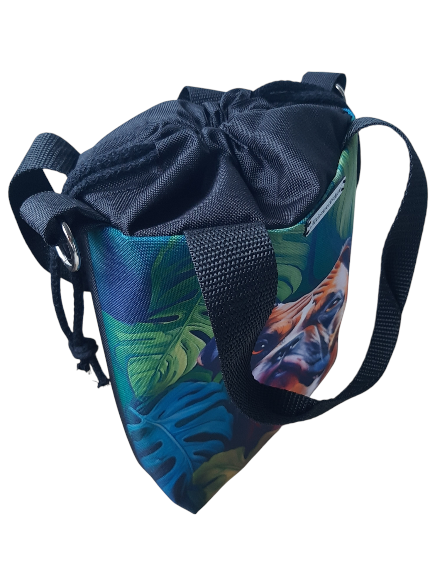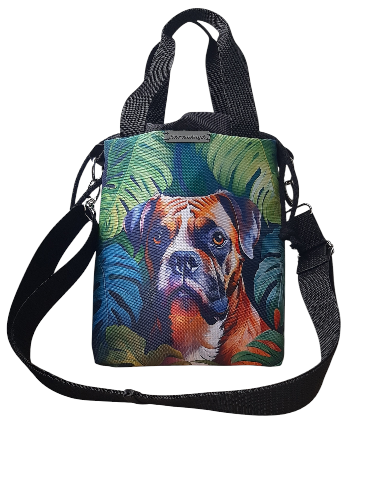 Przód torebki zdobi kolorowy panel z psem rasy BOKSER. Tył gładki jest w kolorze czarnym. W środku, na wodoodpornej podszewce, znajduje się duża kieszeń, zapinana na zamek błyskawiczny. Pomieści ona wszelkie drobiazgi.