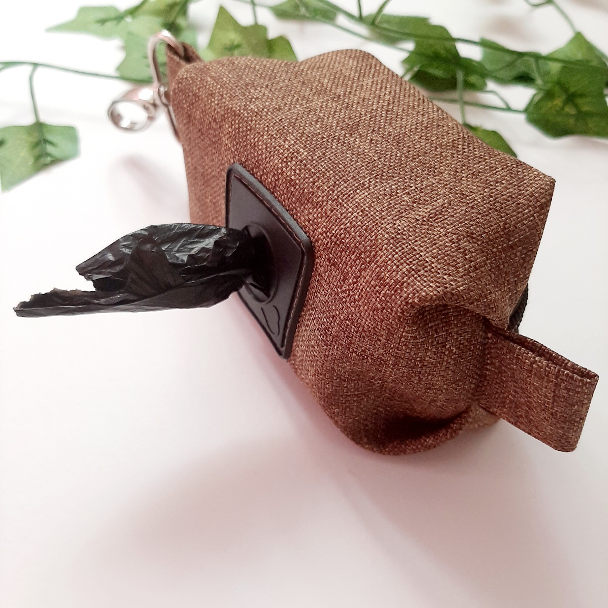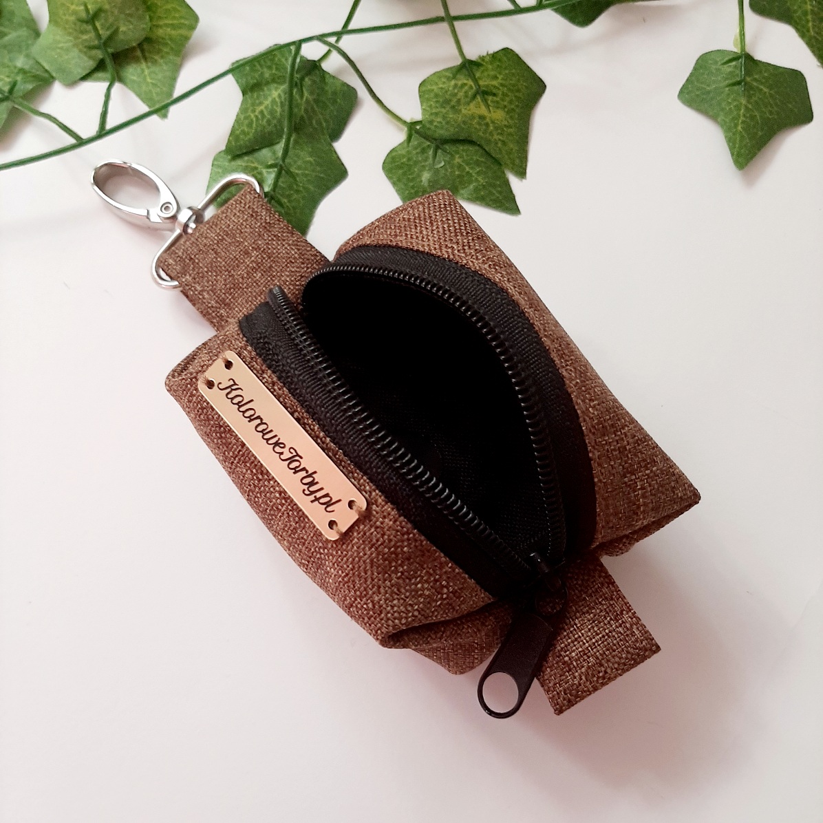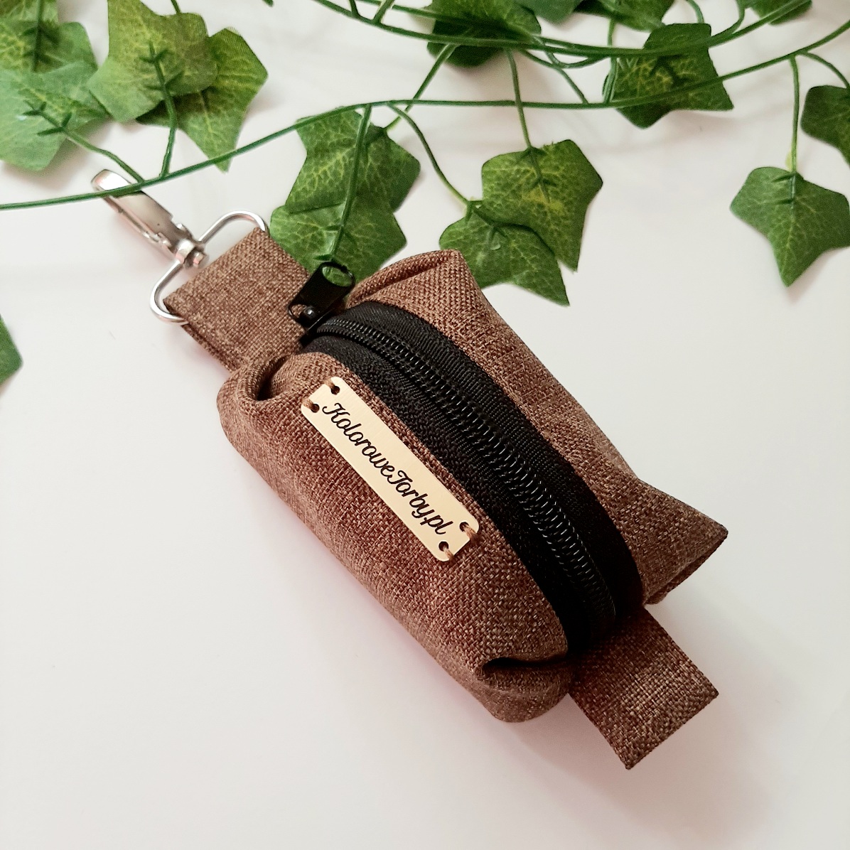BRĄZOWY LEN Etui na kupoworki z gumowym otworem, ułatwiającym wyjmowanie worków. To produkt must have na spacery z psem. Niewielkie, ale pojemne. Z karabińczykiem do zamocowania przy spodniach smyczy oraz na zamek błyskawiczny.