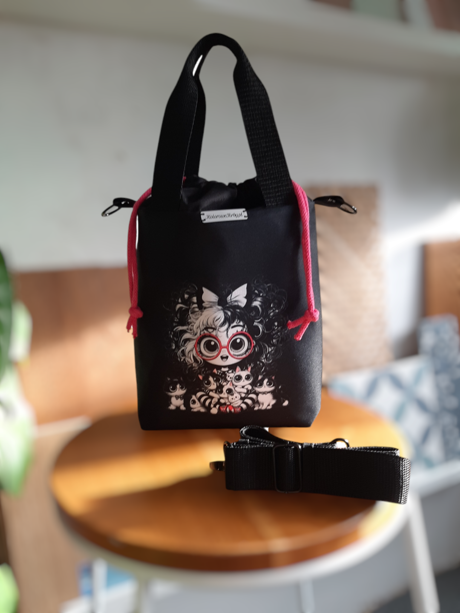 Przód torebki zdobi kolorowy panel z MIŁOŚNICZKĄ KOTÓW. Tył gładki , i podobnie jak wszystkie dodatki, jest w kolorze czarnym. W środku, na wodoodpornej podszewce, znajduje się duża kieszeń, zapinana na zamek błyskawiczny. Pomieści ona wszelkie drobiazgi.