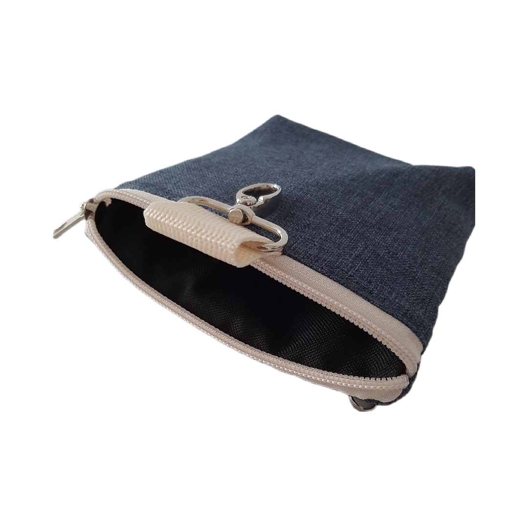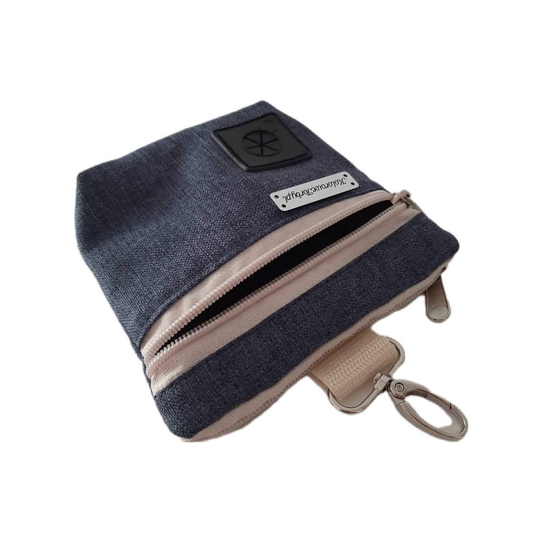 GRANATOWY LEN Saszetka 2w1. Praktyczna i funkcjonalna torebka treningowa niezbędna podczas treningów czy spacerów – nawet tych bardzo długich. Z dwoma niezależnymi kieszeniami: jedną na smaczki dla psa, a drugą na worki na odchody ze specjalnym otworkiem. Obie z zapięciem na zamki błyskawiczne.