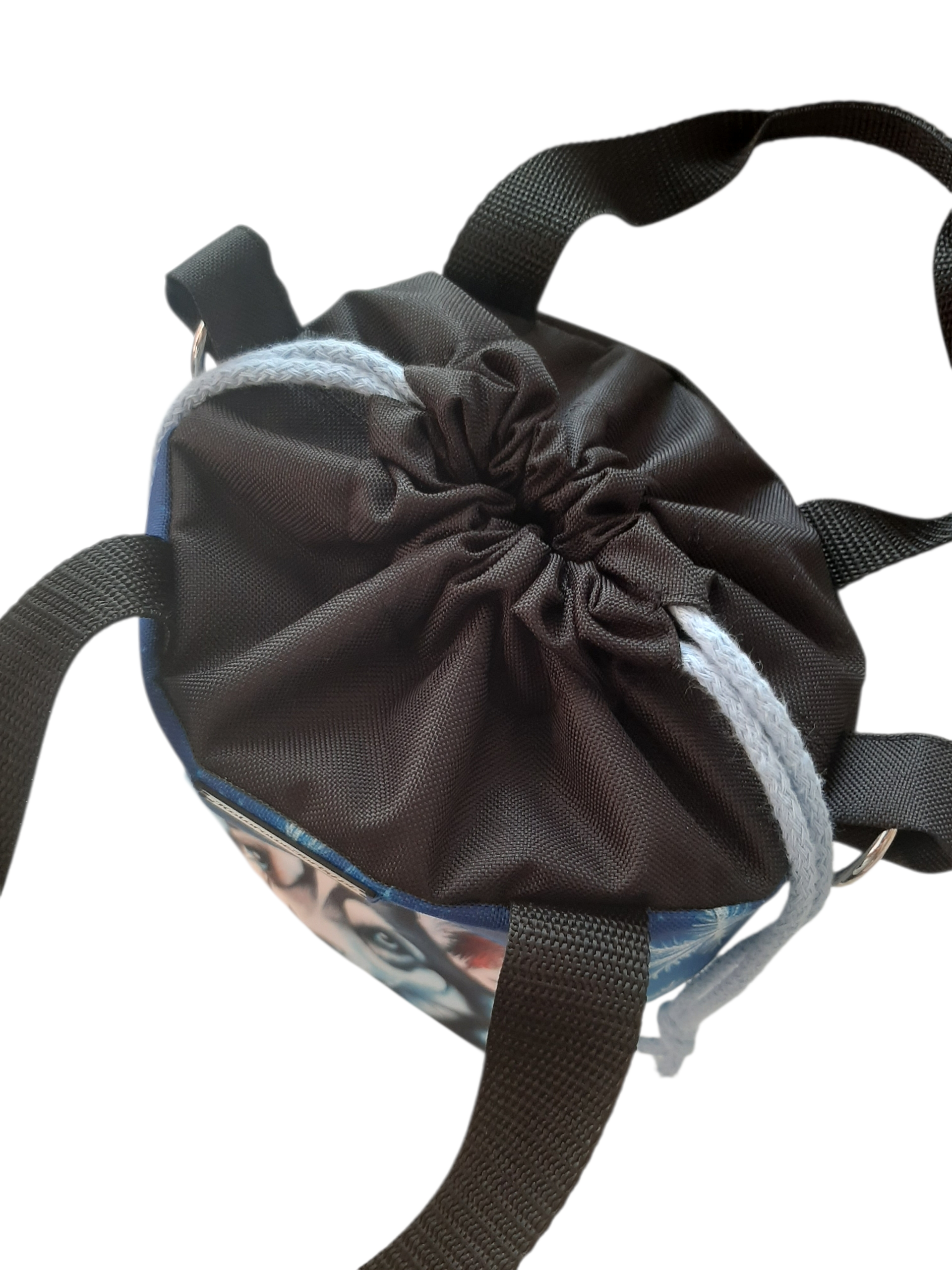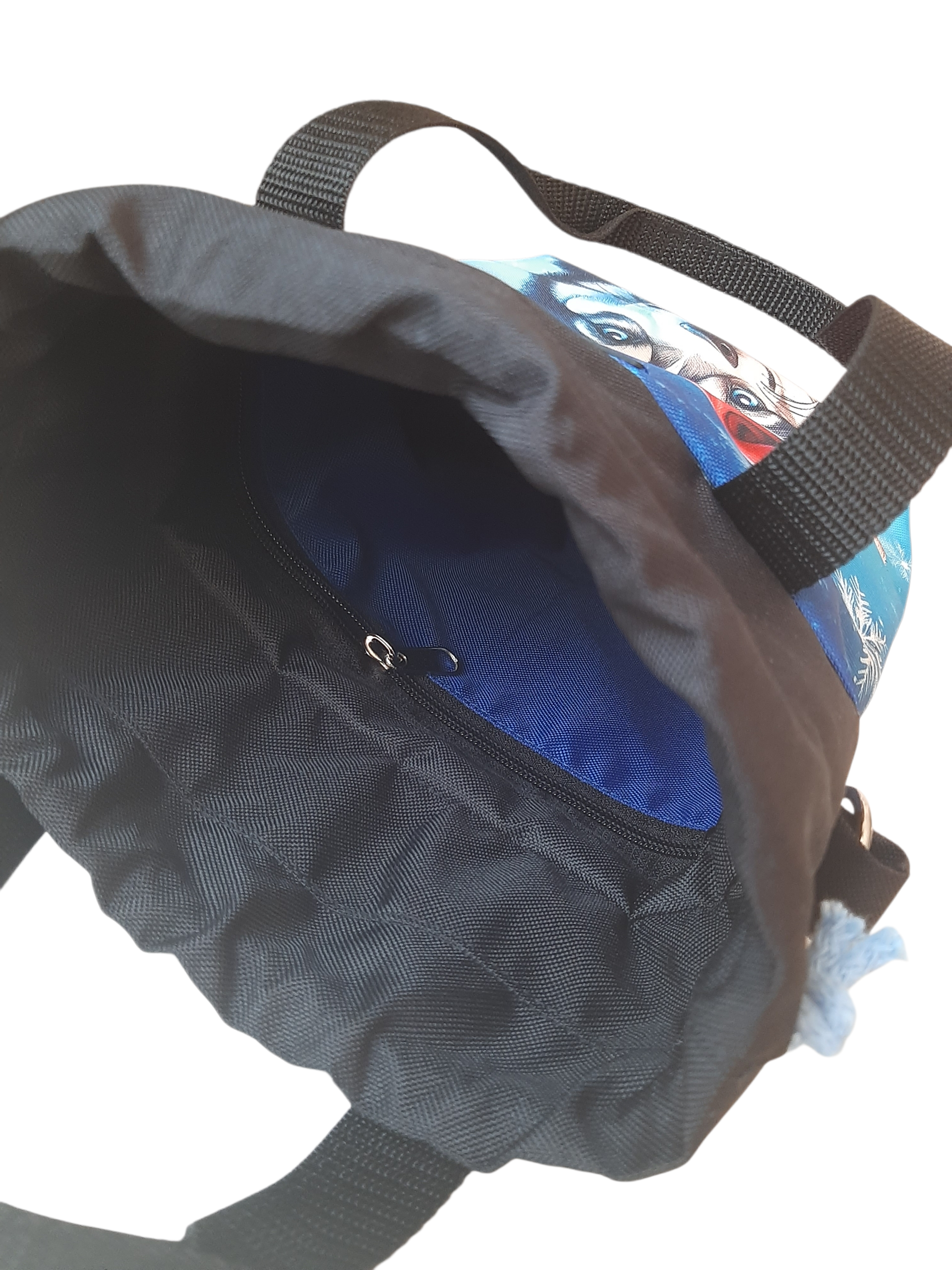 Zapięcie torebki to dwuwarstwowy, wodoodporny komin, ściągany niebieskimi troczkami. To niewątpliwie niezwykle szybkie i funkcjonalne rozwiązanie.