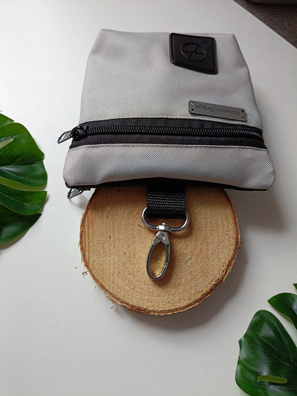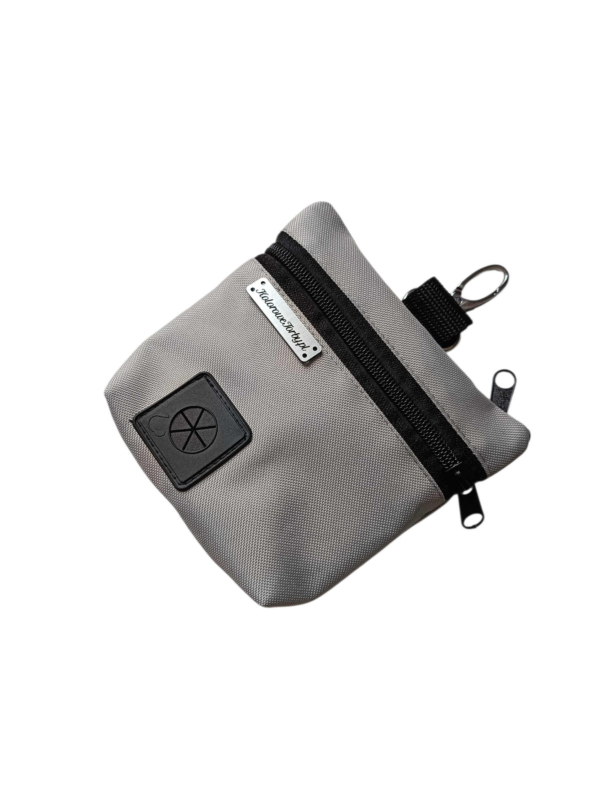 JASNY SZARY Saszetka 2w1. Praktyczna i funkcjonalna torebka treningowa niezbędna podczas treningów czy spacerów – nawet tych bardzo długich. Z dwoma niezależnymi kieszeniami: jedną na smaczki dla psa, a drugą na worki na odchody ze specjalnym otworkiem. Obie z zapięciem na zamki błyskawiczne.
