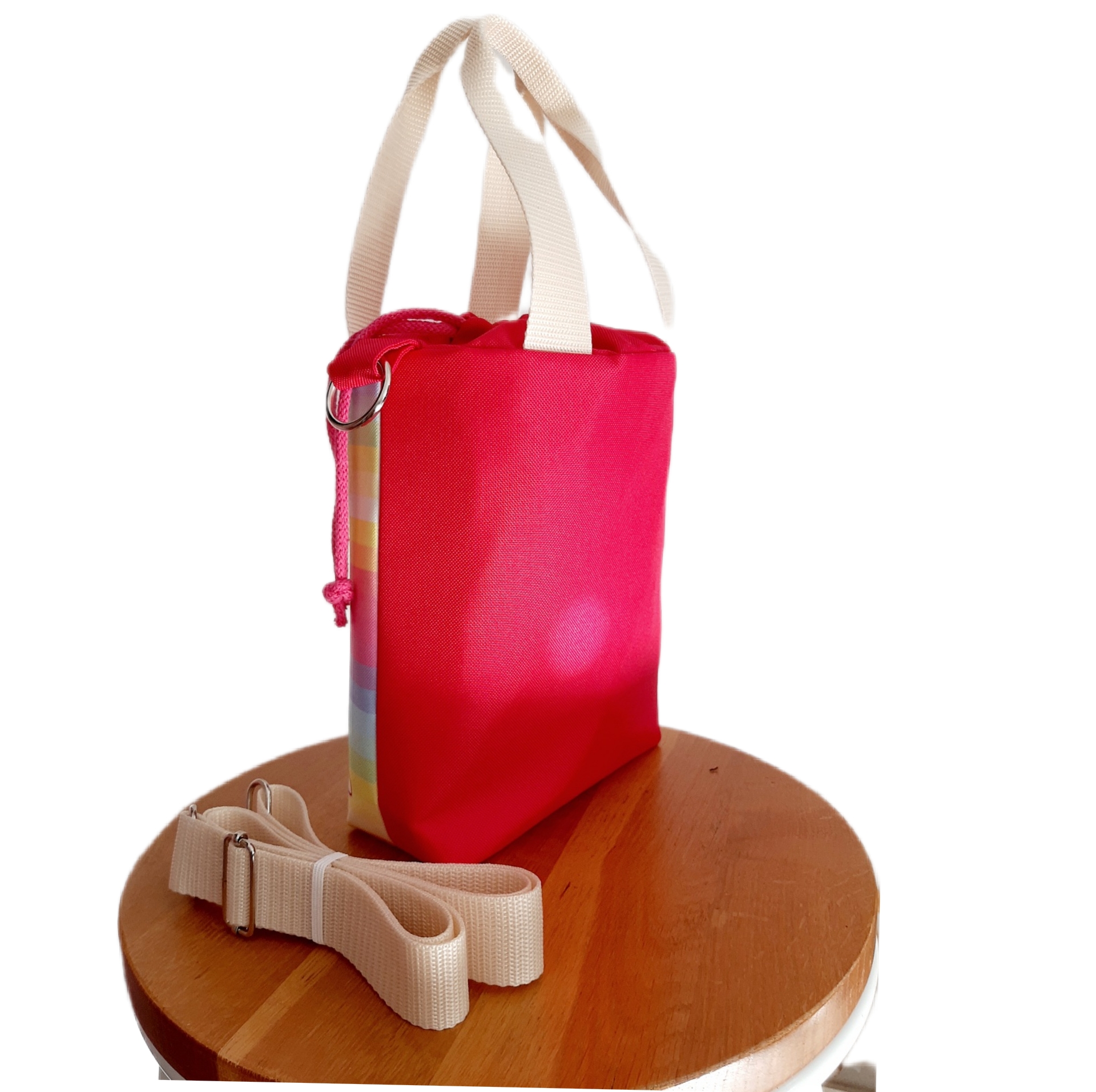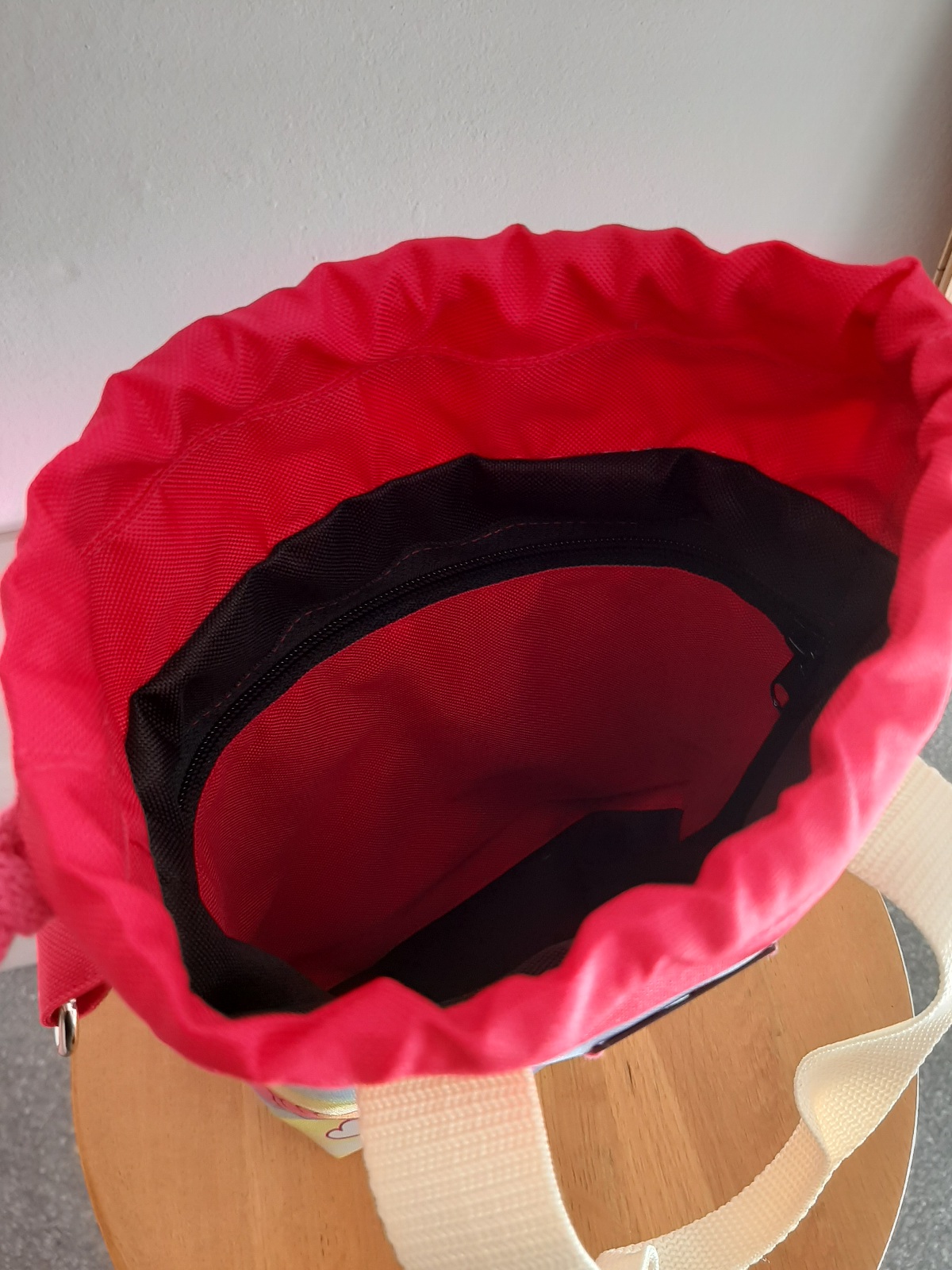 Tył torebki jest w kolorze różowym. W środku, na wodoodpornej podszewce, znajduje się duża kieszeń, zapinana na zamek błyskawiczny. Pomieści ona wszelkie drobiazgi. Zapięcie torebki to dwuwarstwowy, wodoodporny komin w kolorze różowym, ściągany różowymi troczkami. Jest to niezwykle szybkie i funkcjonalne rozwiązanie.
