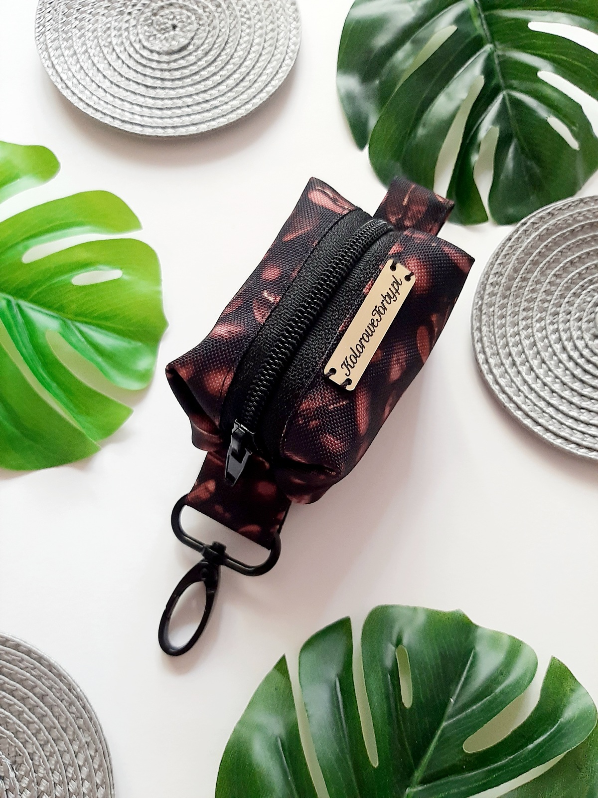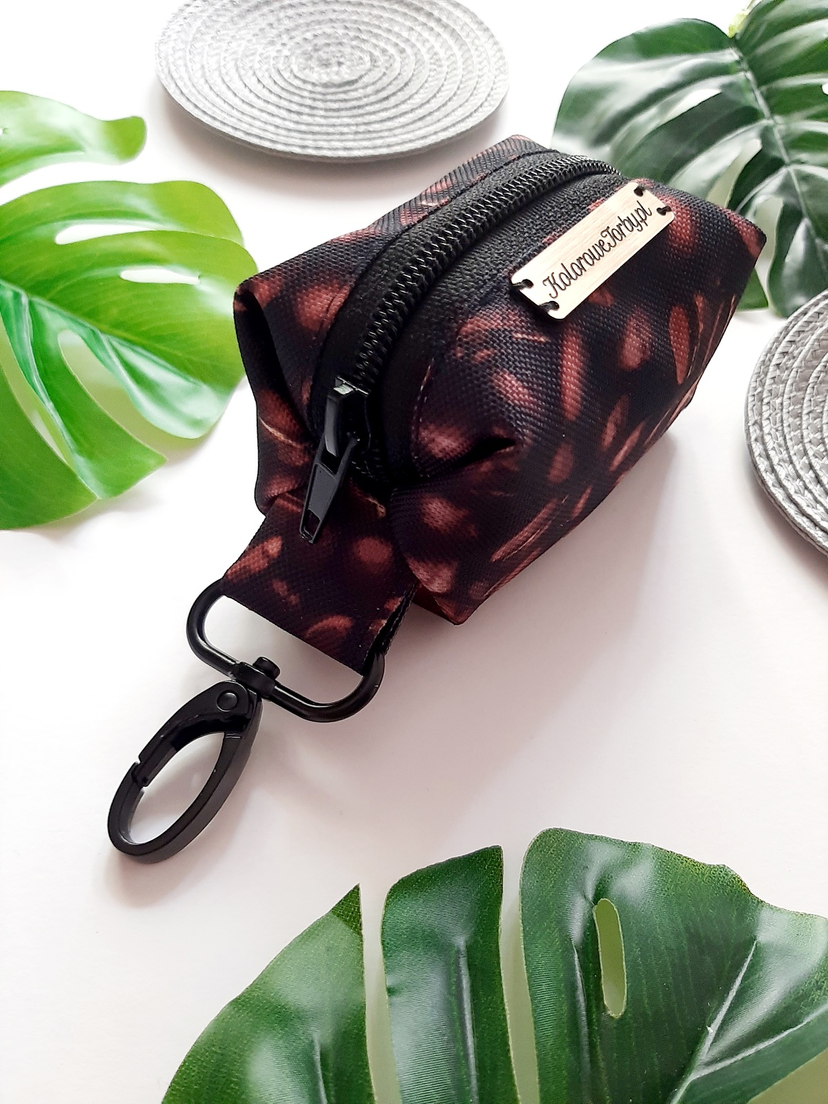 KAWA Etui na kupoworki. Niewielkich rozmiarów etui na woreczki na psie odchody, o ciekawym fasonie. Wykonany z wytrzymałych, wodoodpornych tkanin. Środek w kolorze czarnym (również wodoodporny). Całość zapinana na zamek błyskawiczny.