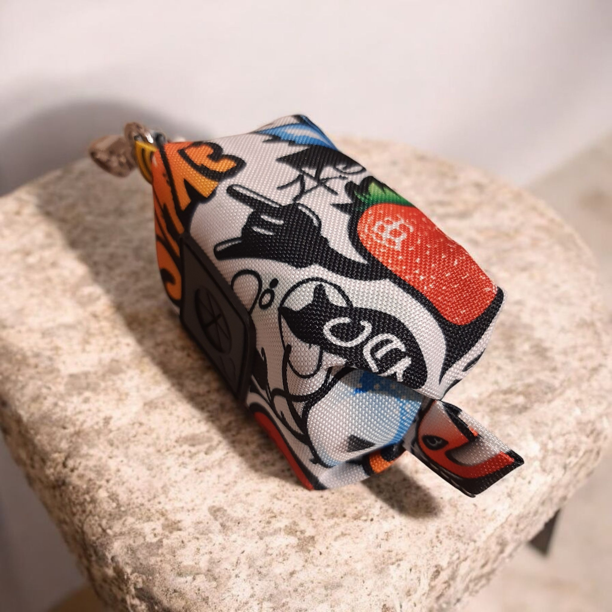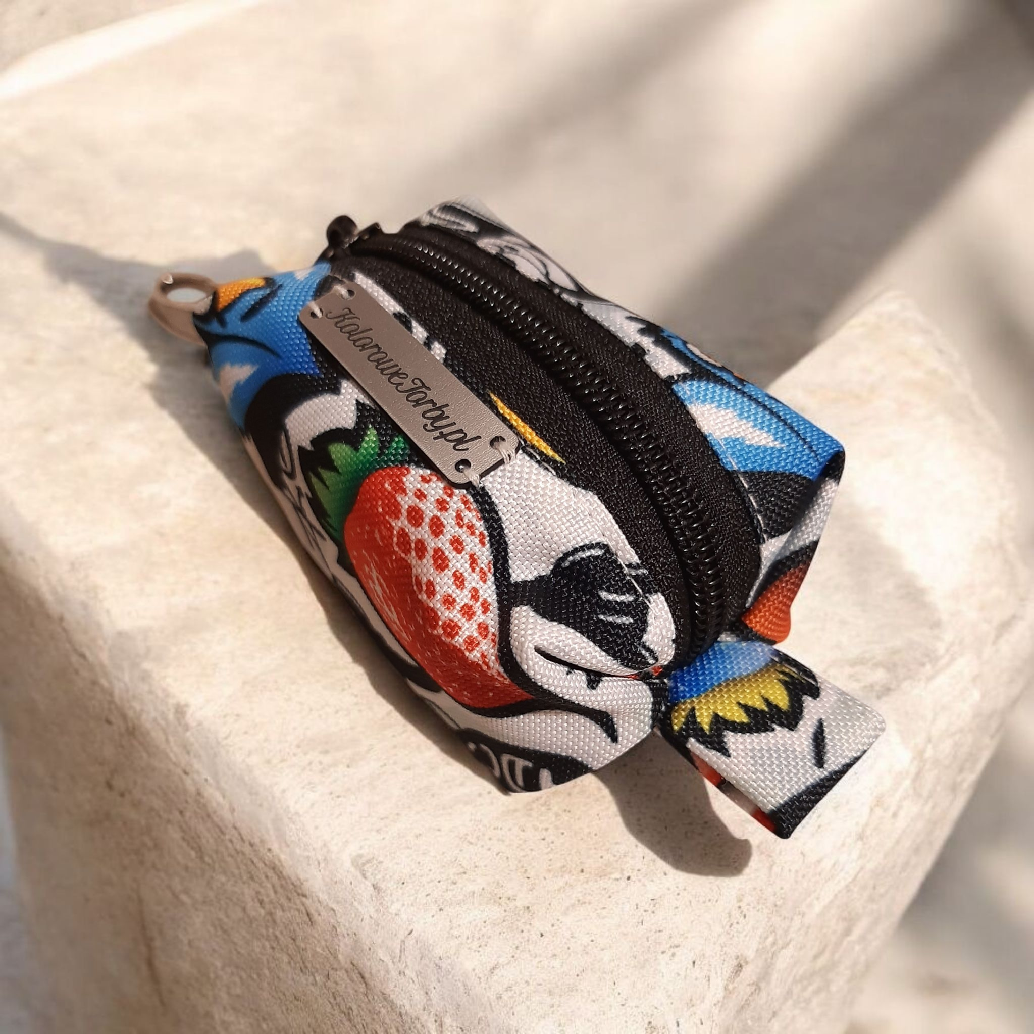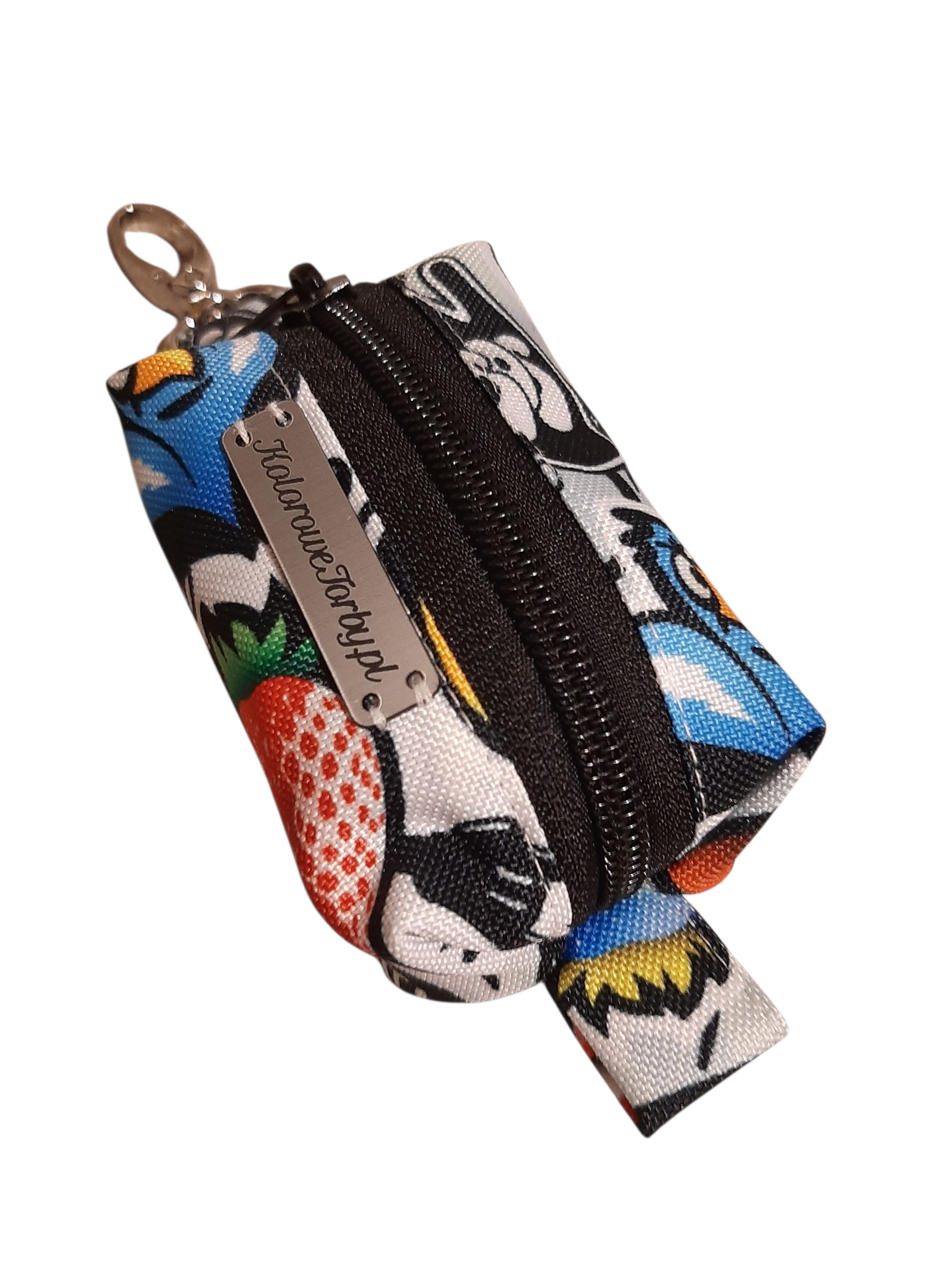 KOMIKS Etui na kupoworki. Niewielkich rozmiarów etui na woreczki na psie odchody o bardzo ciekawym fasonie. Wykonany z wytrzymałych, wodoodpornych tkanin, dzięki czemu nie straszna mu żadna zła pogoda. Wnętrze jest w kolorze czarnym (wykonane również z tkaniny wodoodpornej). Całość zapinana się na zamek błyskawiczny.