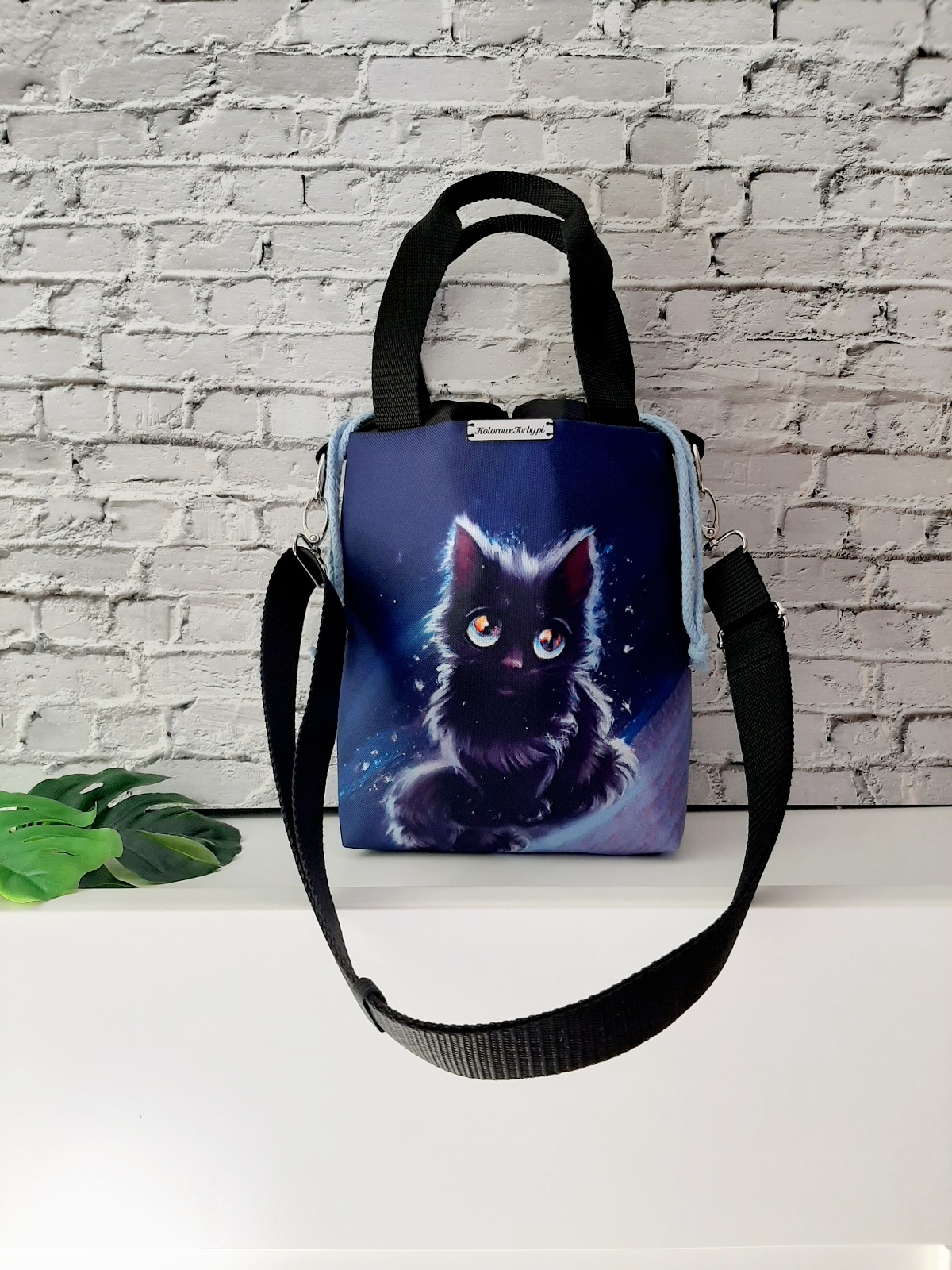 Przód torebki zdobi panel z motywem słodkiego kotka. Tył gładki jest w kolorze czarnym. W środku, na wodoodpornej podszewce, znajduje się duża kieszeń, zapinana na zamek błyskawiczny. Pomieści ona wszelkie drobiazgi.