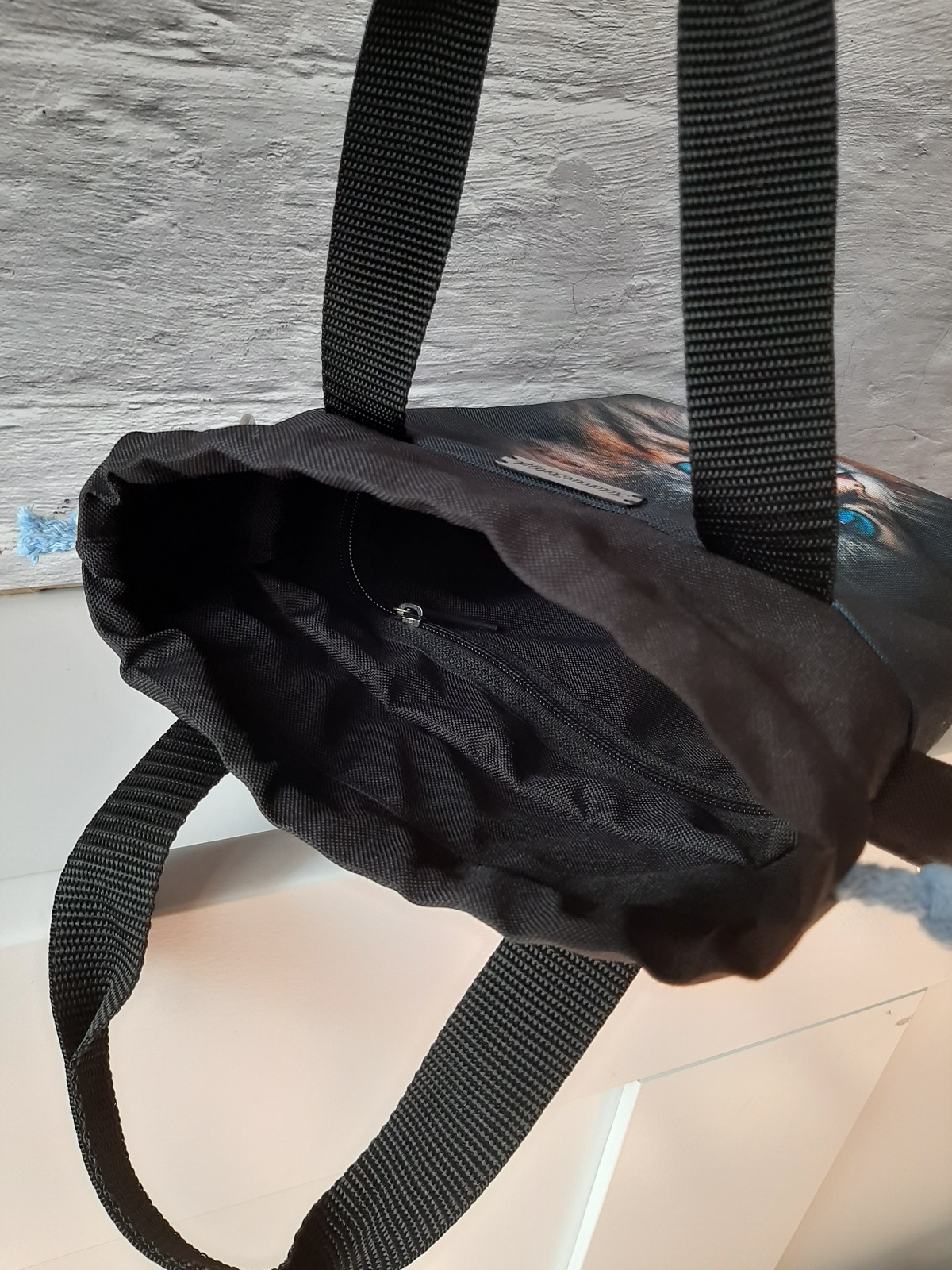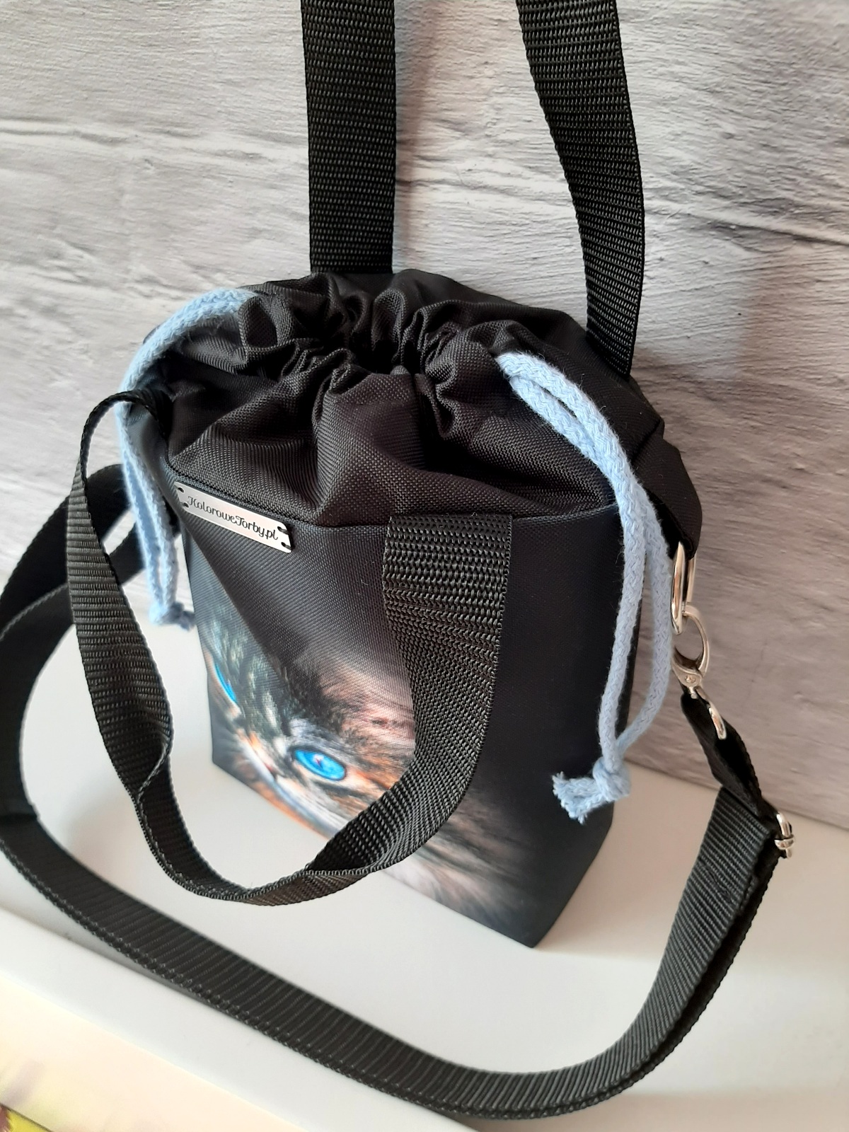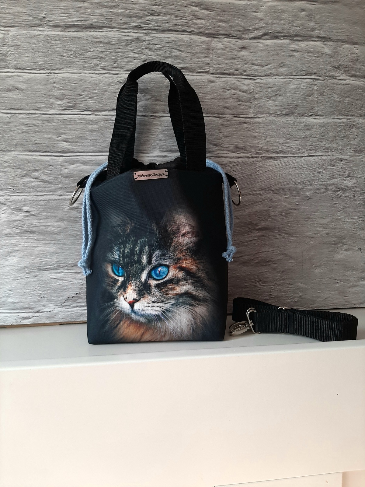 Przód torebki zdobi panel z Kotkiem o pięknych, błękitnych oczach. Tył jest w kolorze czarnym. W środku, na wodoodpornej podszewce, znajduje się duża kieszeń, zapinana na zamek błyskawiczny, która pomieści ona wszelkie drobiazgi. Zapięcie torebki to dwuwarstwowy, wodoodporny komin w kolorze czarnym, ściągany niebieskimi troczkami. Jest to niezwykle szybkie i funkcjonalne rozwiązanie.