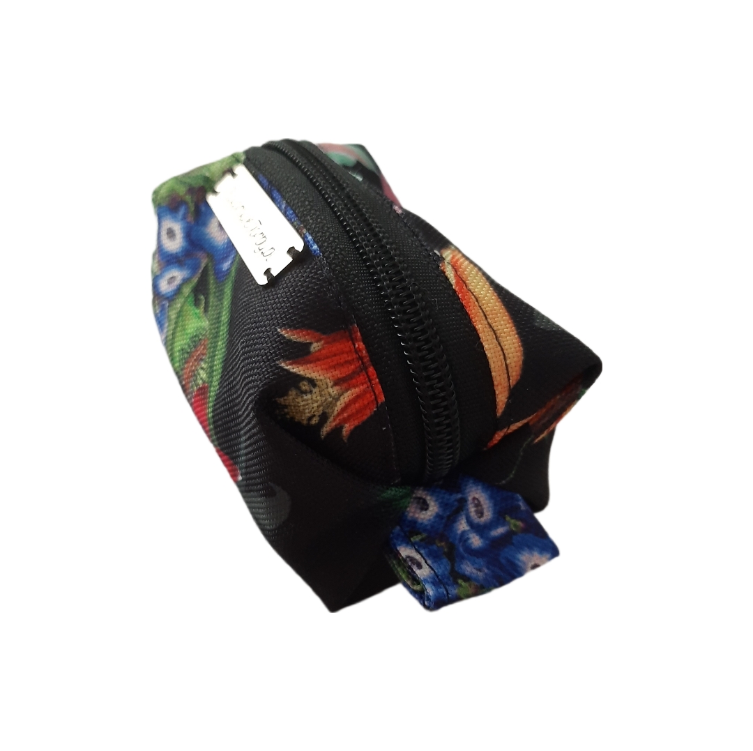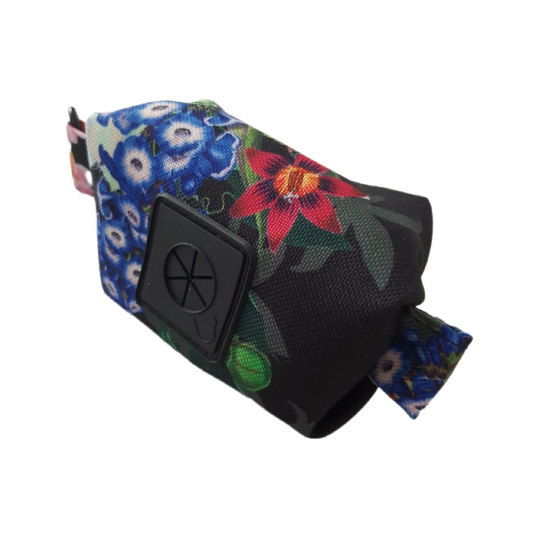 KWIATY01 Etui na kupoworki. Niewielkich rozmiarów etui na woreczki na psie odchody o ciekawym fasonie. Wykonany z wytrzymałych, wodoodpornych tkanin. Środek w kolorze czarnym (również wodoodporny). Całość zapinana na zamek błyskawiczny.