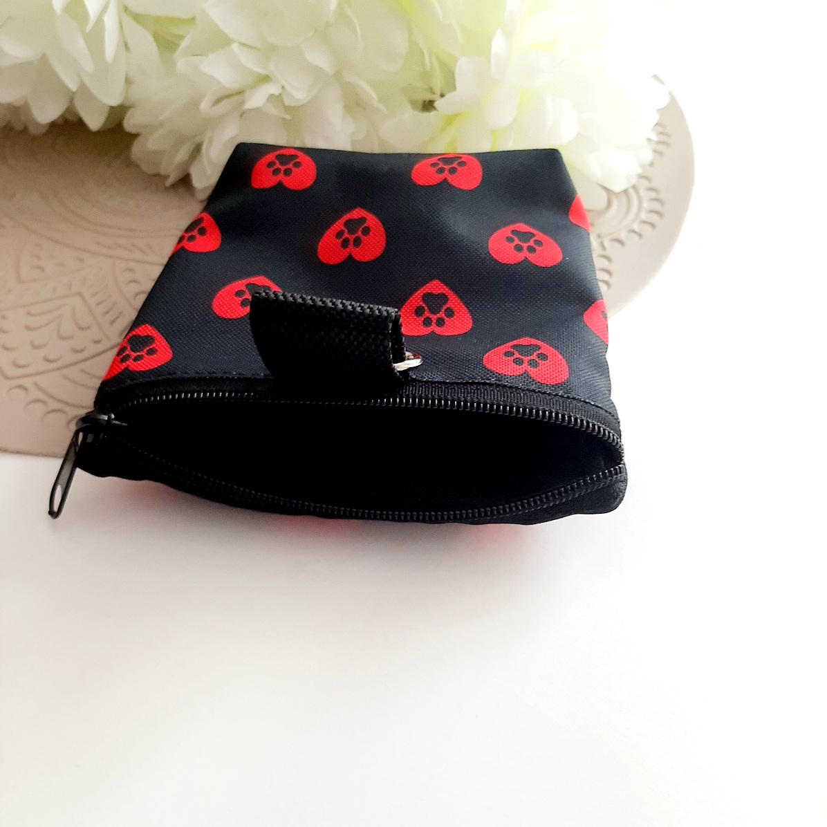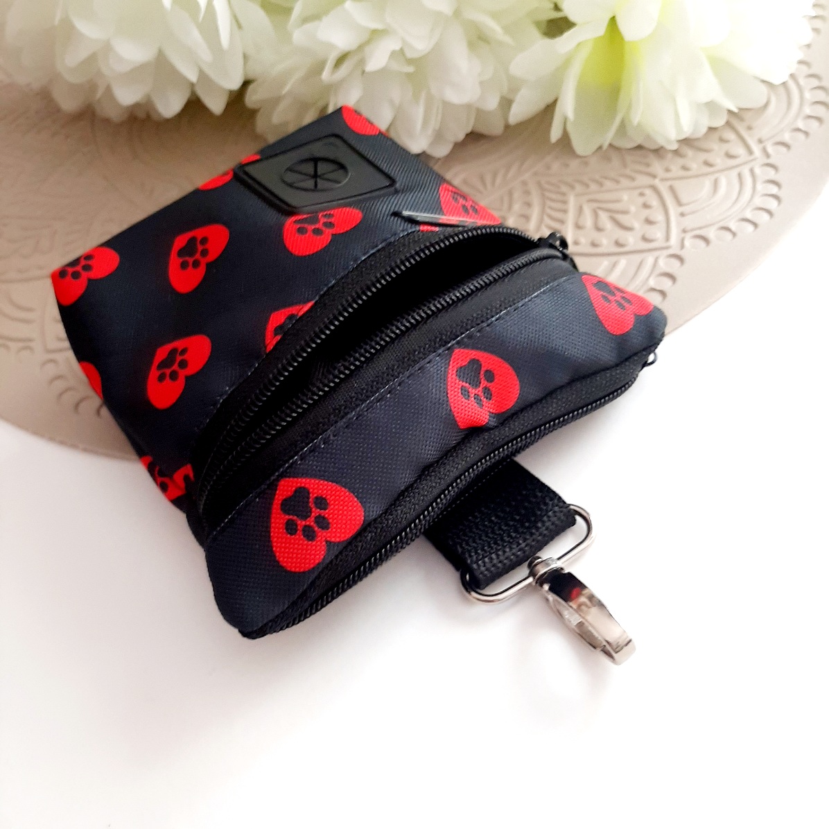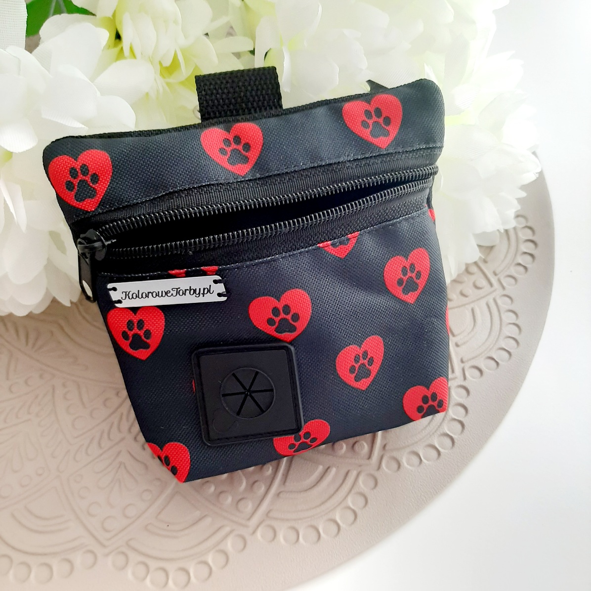 ŁAPKI03 Saszetka 2w1. Praktyczna i funkcjonalna torebka 2w1 niezbędna podczas treningów czy spacerów. Z dwoma niezależnymi kieszeniami: jedną na smaczki, a drugą na worki na odchody. Wykonana z tkanin wodoodpornych, środek w kolorze czarnym. Z karabińczykiem do zamocowania np. przy spodniach.