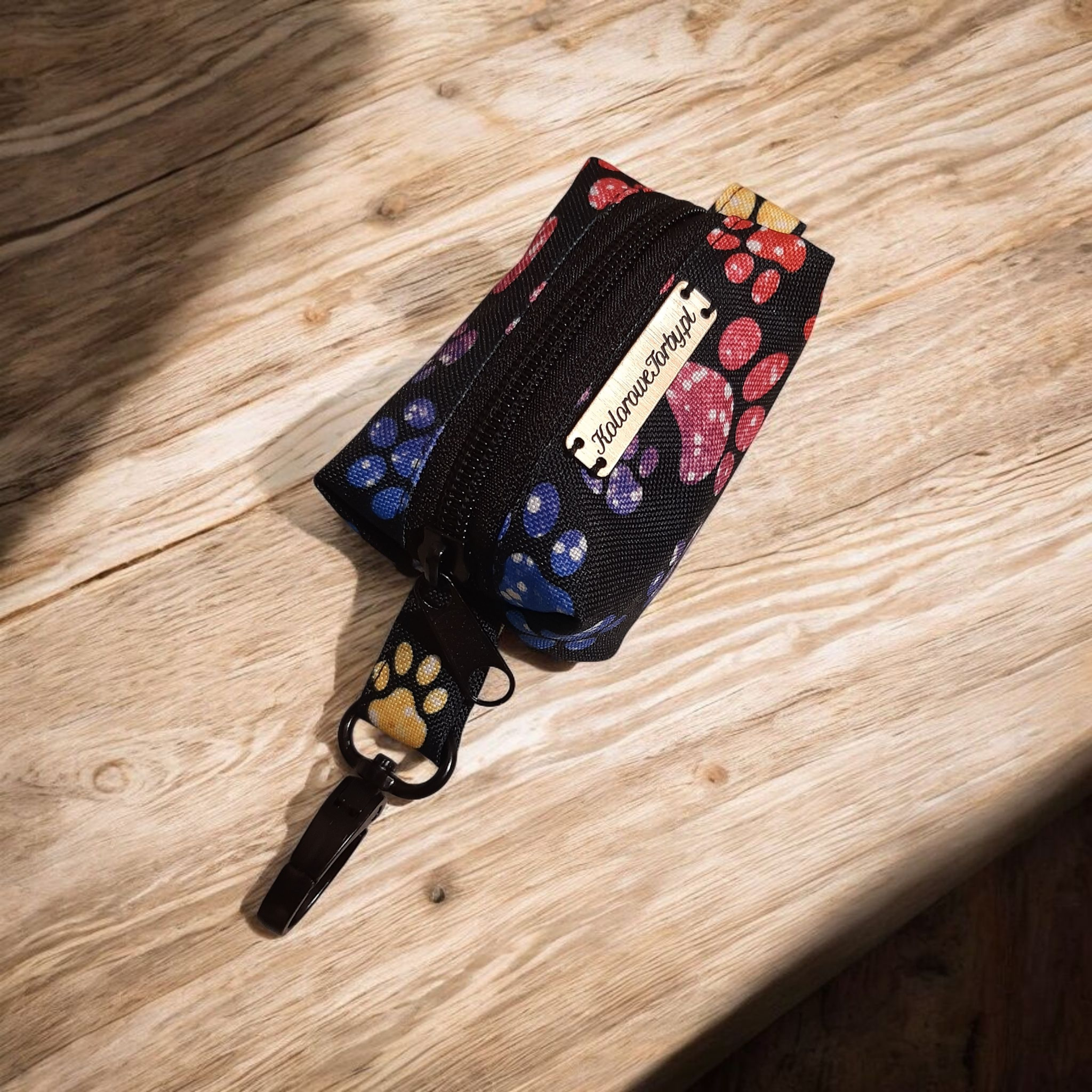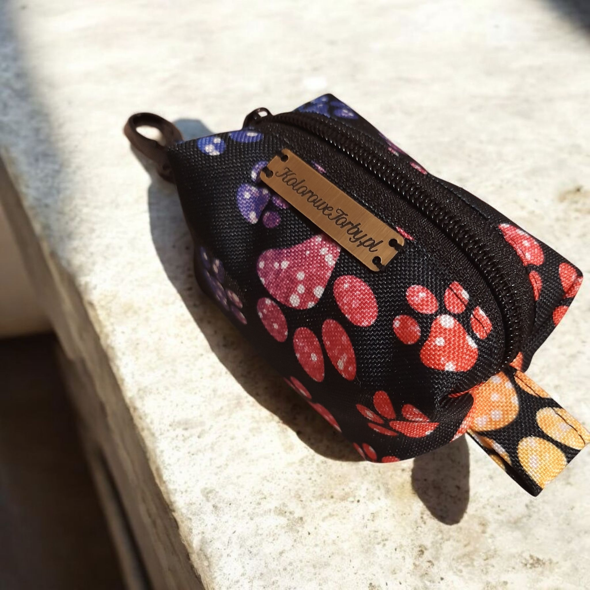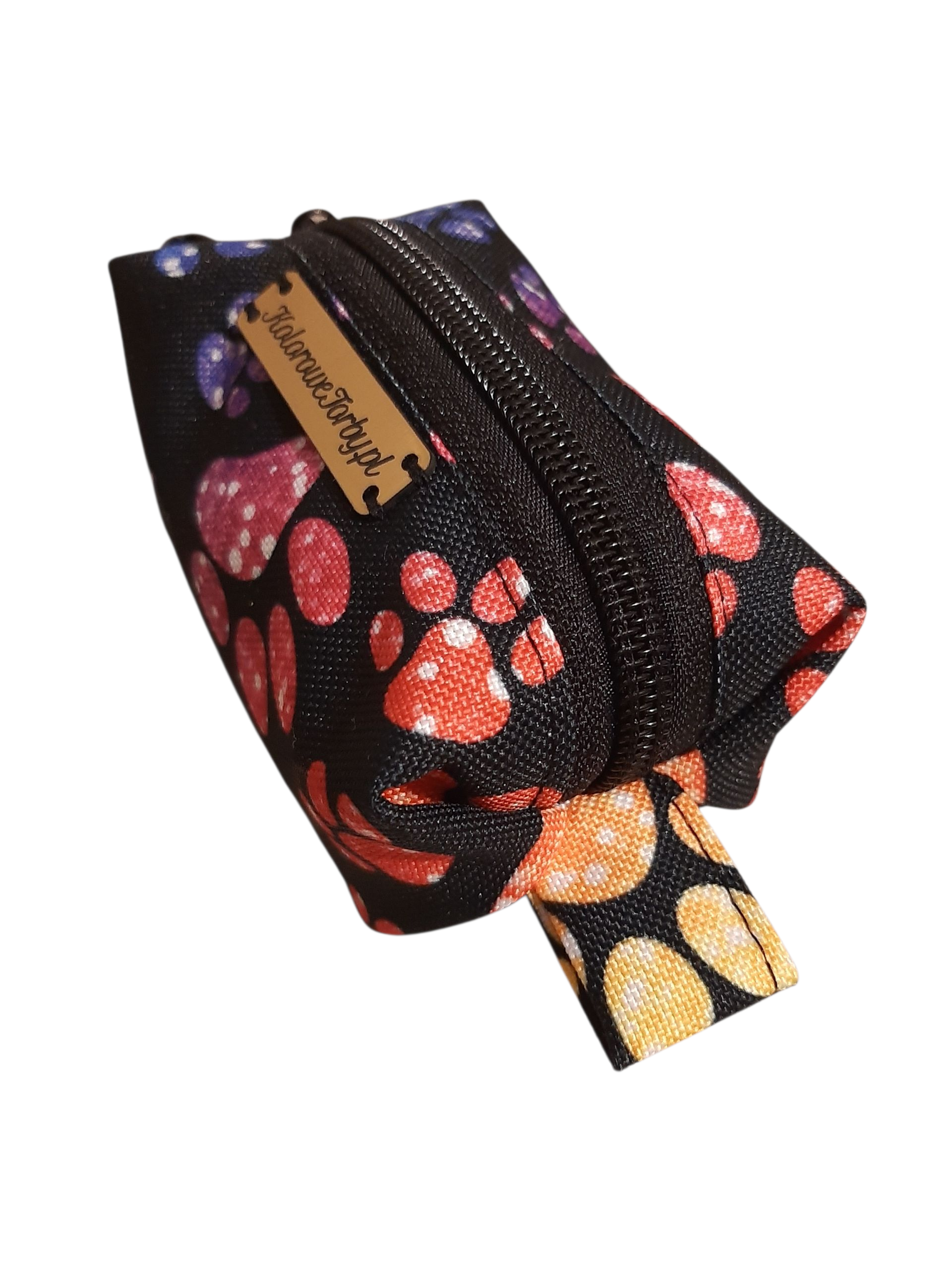 ŁAPKI04 Etui na kupoworki. Niewielkich rozmiarów etui na woreczki na psie odchody o bardzo ciekawym fasonie. Wykonany z wytrzymałych, wodoodpornych tkanin, dzięki czemu nie straszna mu żadna zła pogoda. Wnętrze jest w kolorze czarnym (wykonane również z tkaniny wodoodpornej). Całość zapinana się na zamek błyskawiczny.