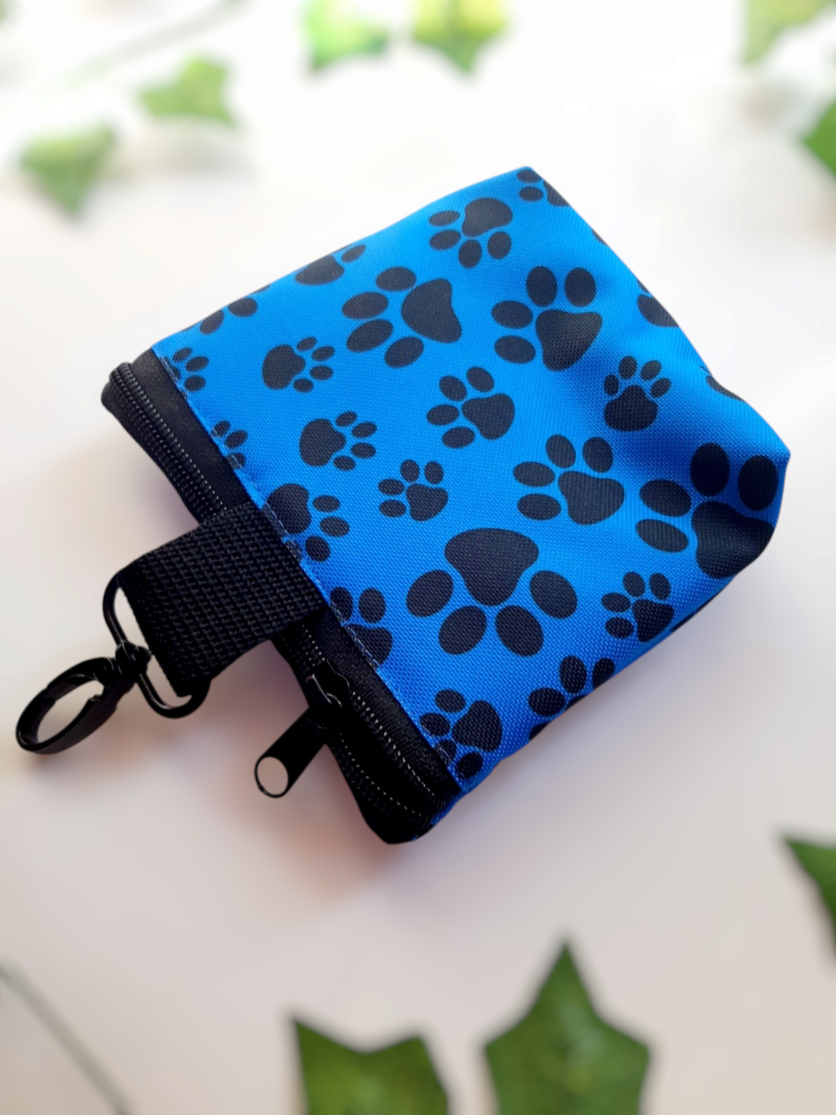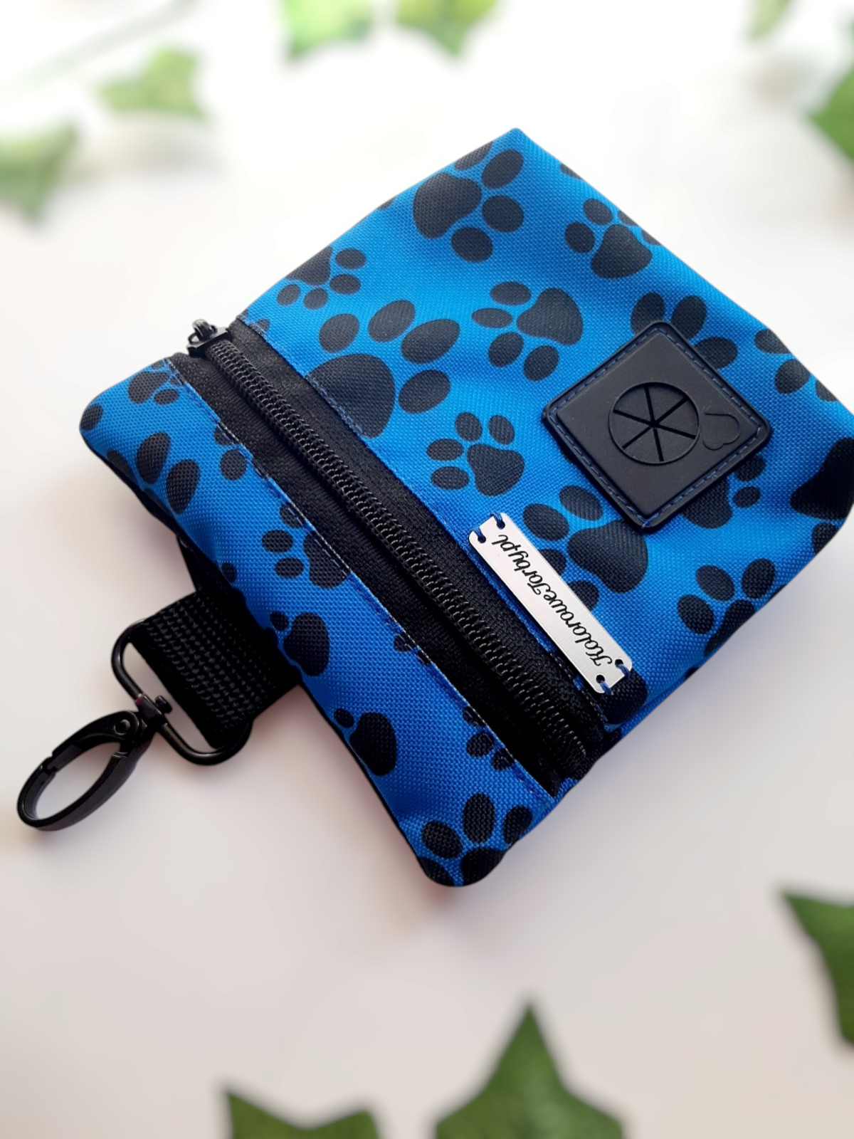 ŁAPKI02 Saszetka 2w1. Praktyczna i funkcjonalna torebka 2w1 niezbędna podczas treningów czy spacerów. Z dwoma niezależnymi kieszeniami: jedną na smaczki, a drugą na worki na odchody. Wykonana z tkanin wodoodpornych, środek w kolorze czarnym. Z karabińczykiem do zamocowania np. przy spodniach.