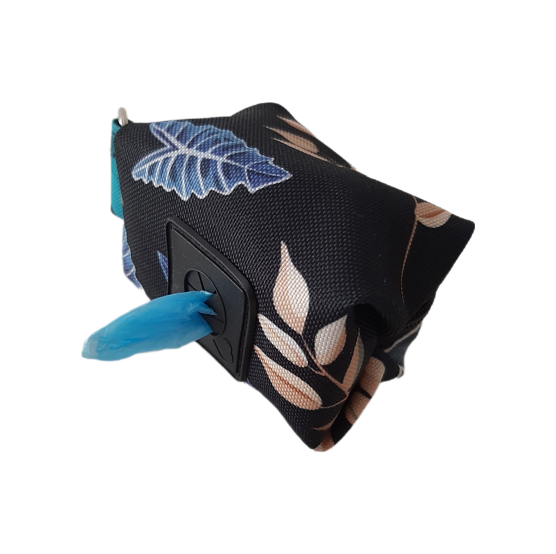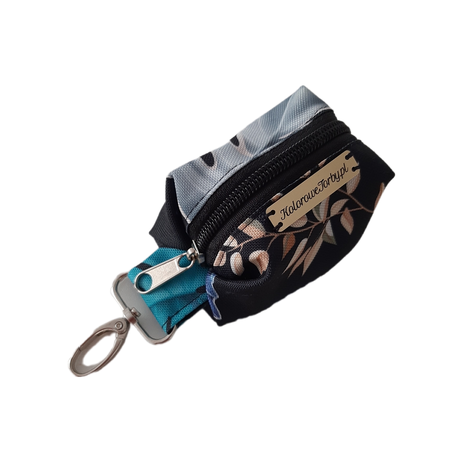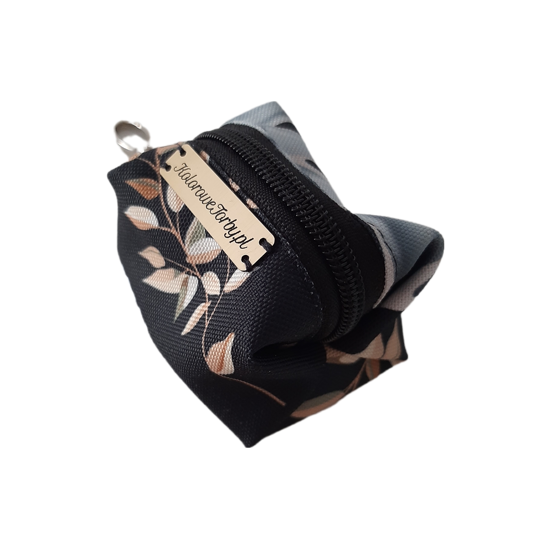 LIŚCIE01 Etui na kupoworki. Niewielkich rozmiarów etui na woreczki na psie odchody o ciekawym fasonie. Wykonany z wytrzymałych, wodoodpornych tkanin. Środek w kolorze czarnym (również wodoodporny). Zapięcie na zamek błyskawiczny to gwarancja, że worki nie wypadną. To niezastąpiony gadżet dla każdego właściciela psa, który dba o porządek podczas spacerów.