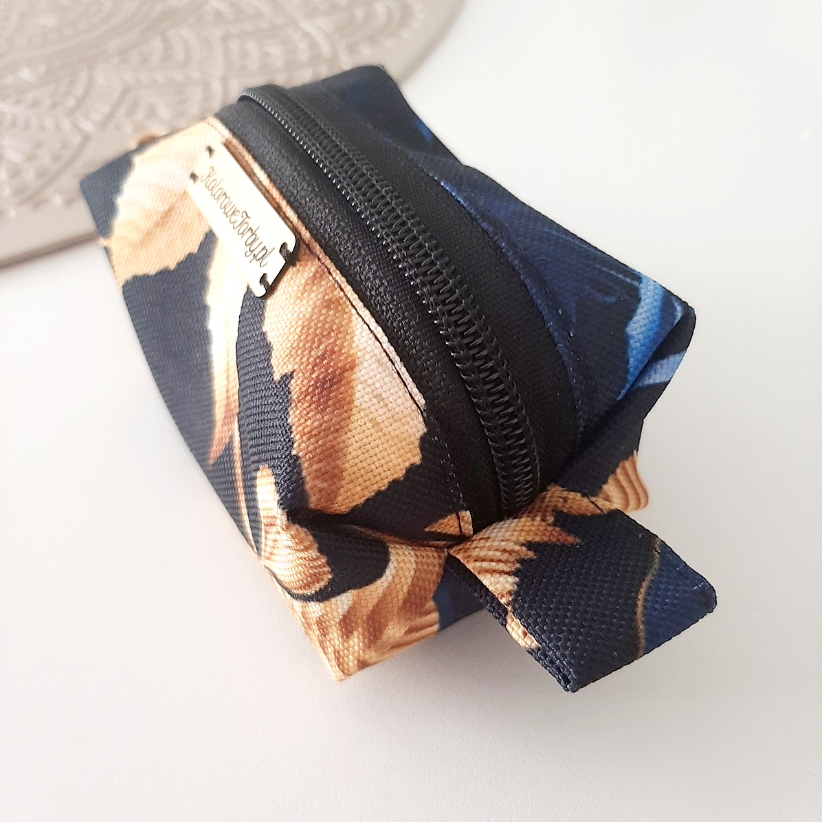 LIŚCIE02 Etui na kupoworki to niewielkich rozmiarów torebka na woreczki, tak potrzebna na każdym spacerze z psem. Ma bardzo ciekawy fason. Wykonany jest z wytrzymałych, wodoodpornych tkanin. Środek jest w kolorze czarnym (również wodoodporny). Całość zapina się na zamek błyskawiczny.