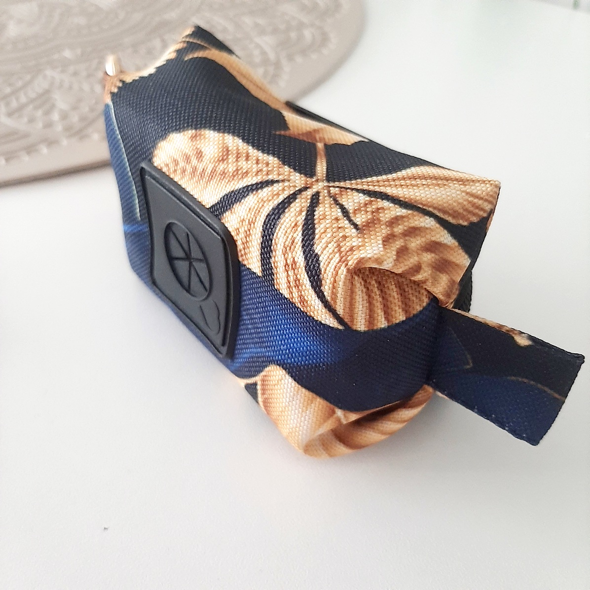 LIŚCIE02 Etui na kupoworki z gumowym otworem, ułatwiającym wyjmowanie worków. To produkt must have na spacery z psem. Niewielkie, ale pojemne. Z karabińczykiem do zamocowania przy spodniach smyczy oraz zapięciem na zamek błyskawiczny.