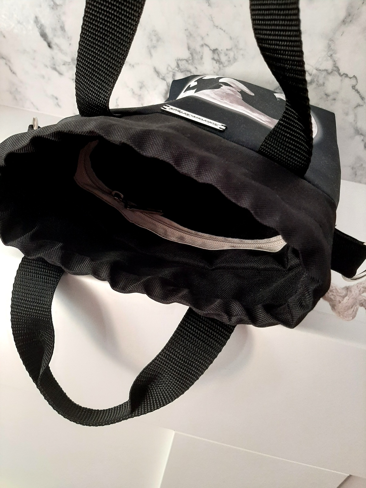 Zapięcie torebki to dwuwarstwowy, wodoodporny komin w kolorze czarnym, ściągany beżowymi troczkami. Jest to niezwykle szybkie i funkcjonalne rozwiązanie.