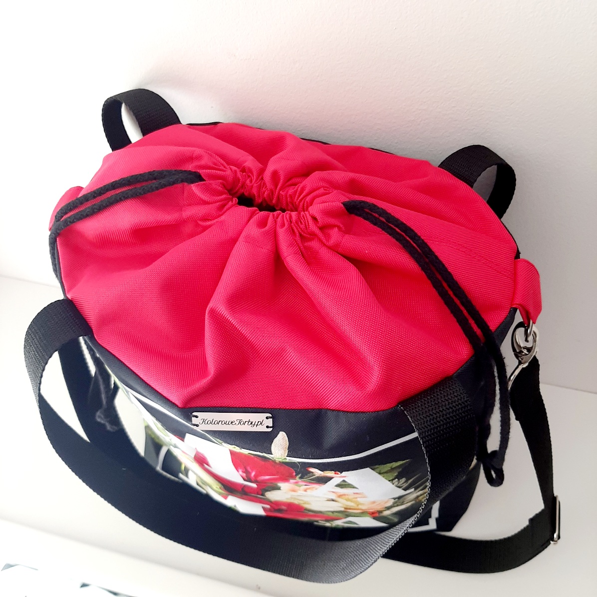 W środku, na czarnej i wodoodpornej podszewce, znajdują się dwie kieszenie. Jedna na zamek, druga otwarta np. na telefon. Torebka jest bardzo pojemna. Bez problemu pomieści rozmiar A4. Zapięcie torby to dwuwarstwowy, wodoodporny komin w kolorze różowym, ściągany czarnymi troczkami. Jest to niezwykle szybkie i funkcjonalne rozwiązanie.