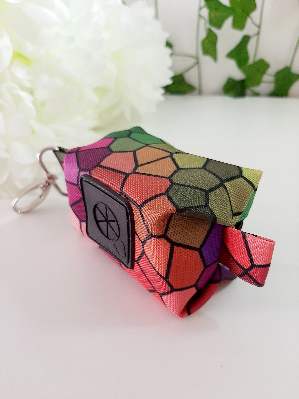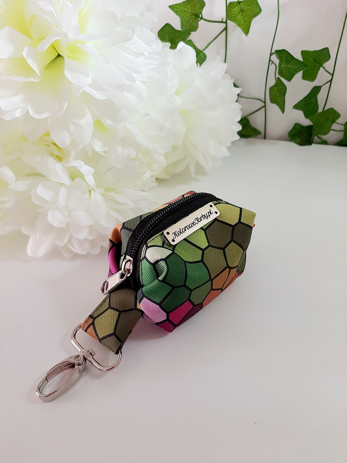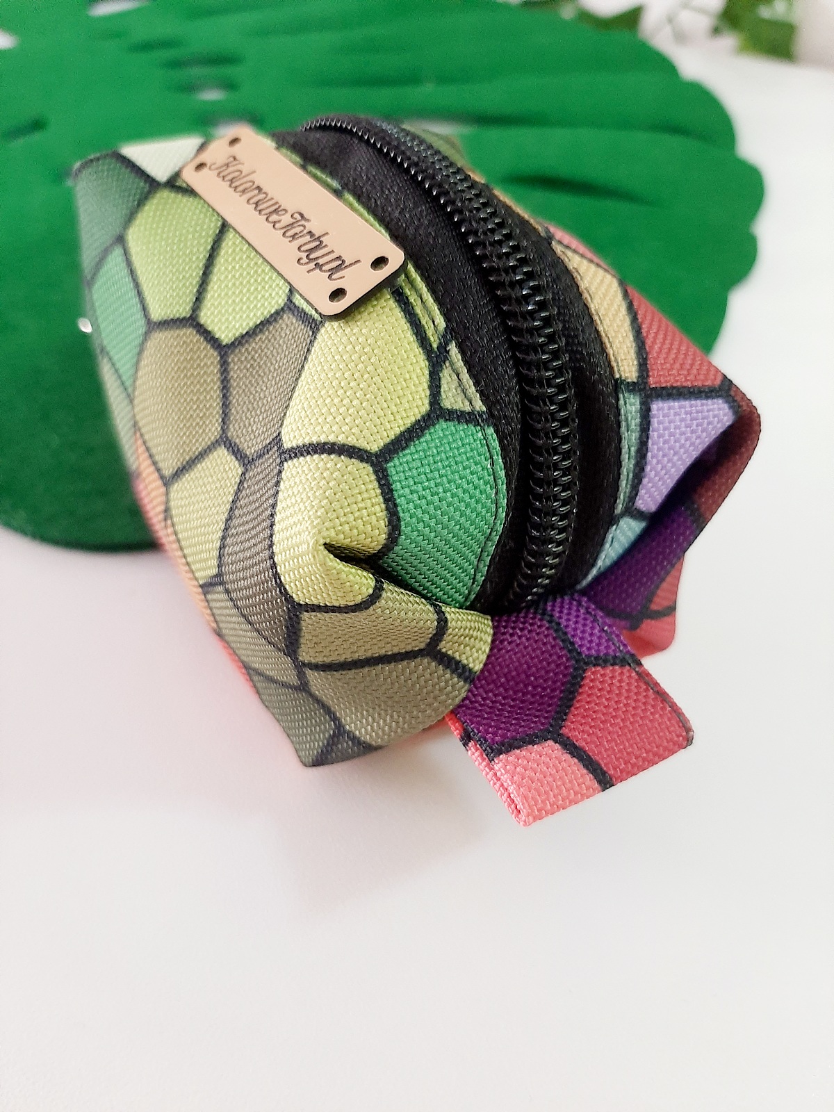MOZAIKA Etui na kupoworki. Niewielkich rozmiarów etui na woreczki na psie odchody o bardzo ciekawym fasonie. Wykonany z wytrzymałych, wodoodpornych tkanin, dzięki czemu nie straszna mu żadna zła pogoda. Wnętrze jest w kolorze czarnym (wykonane również z tkaniny wodoodpornej). Całość zapinana się na zamek błyskawiczny.
