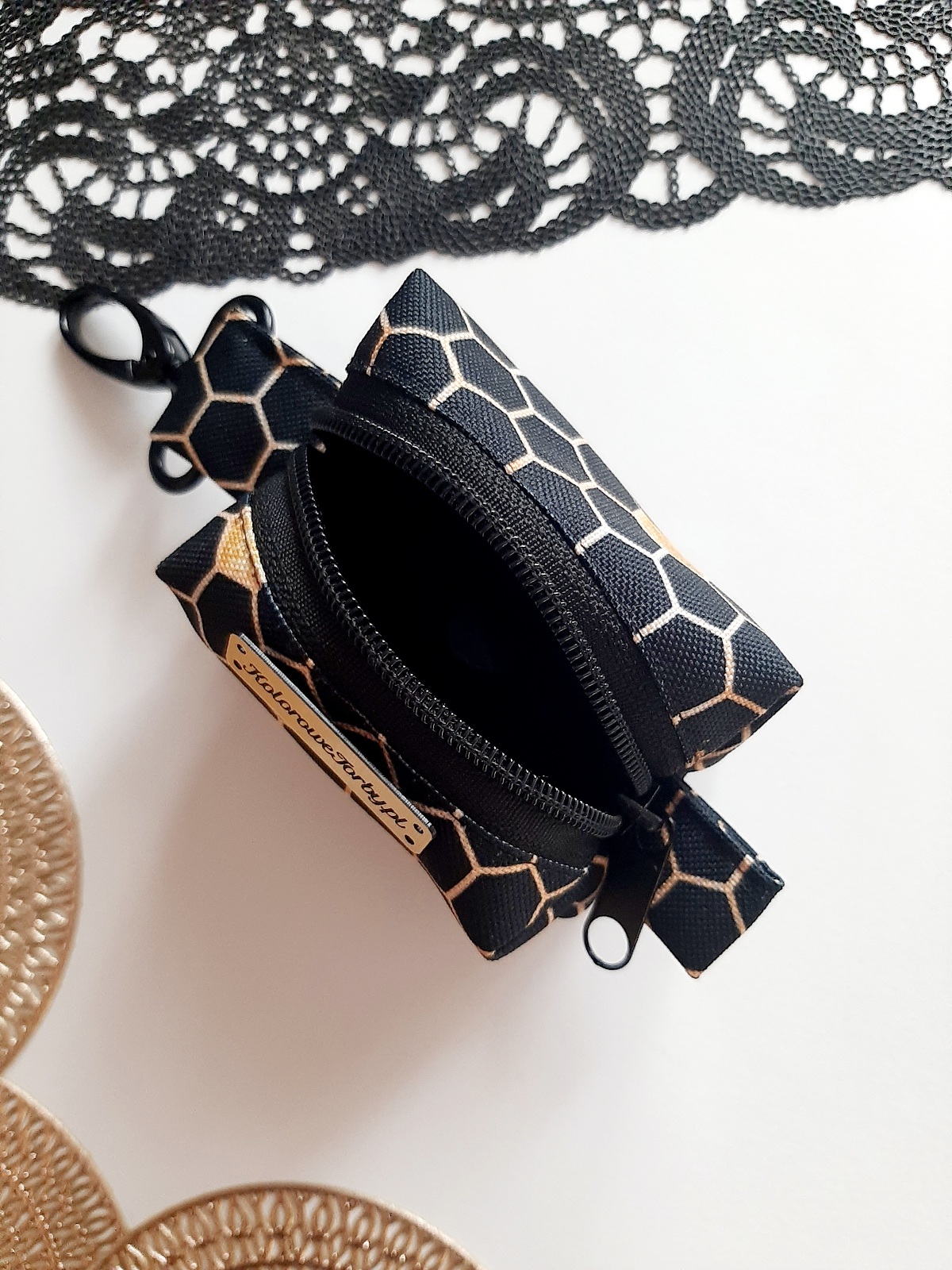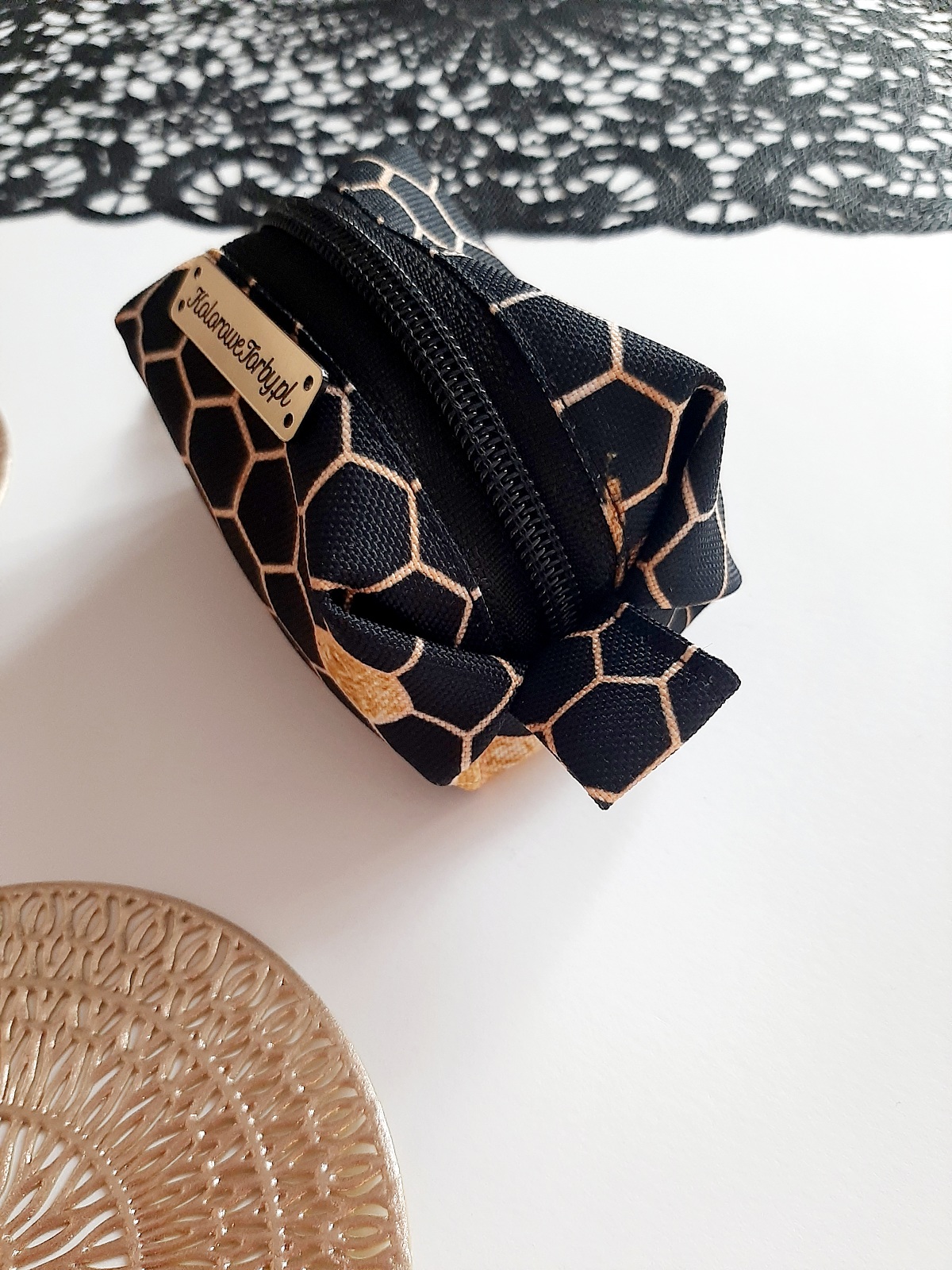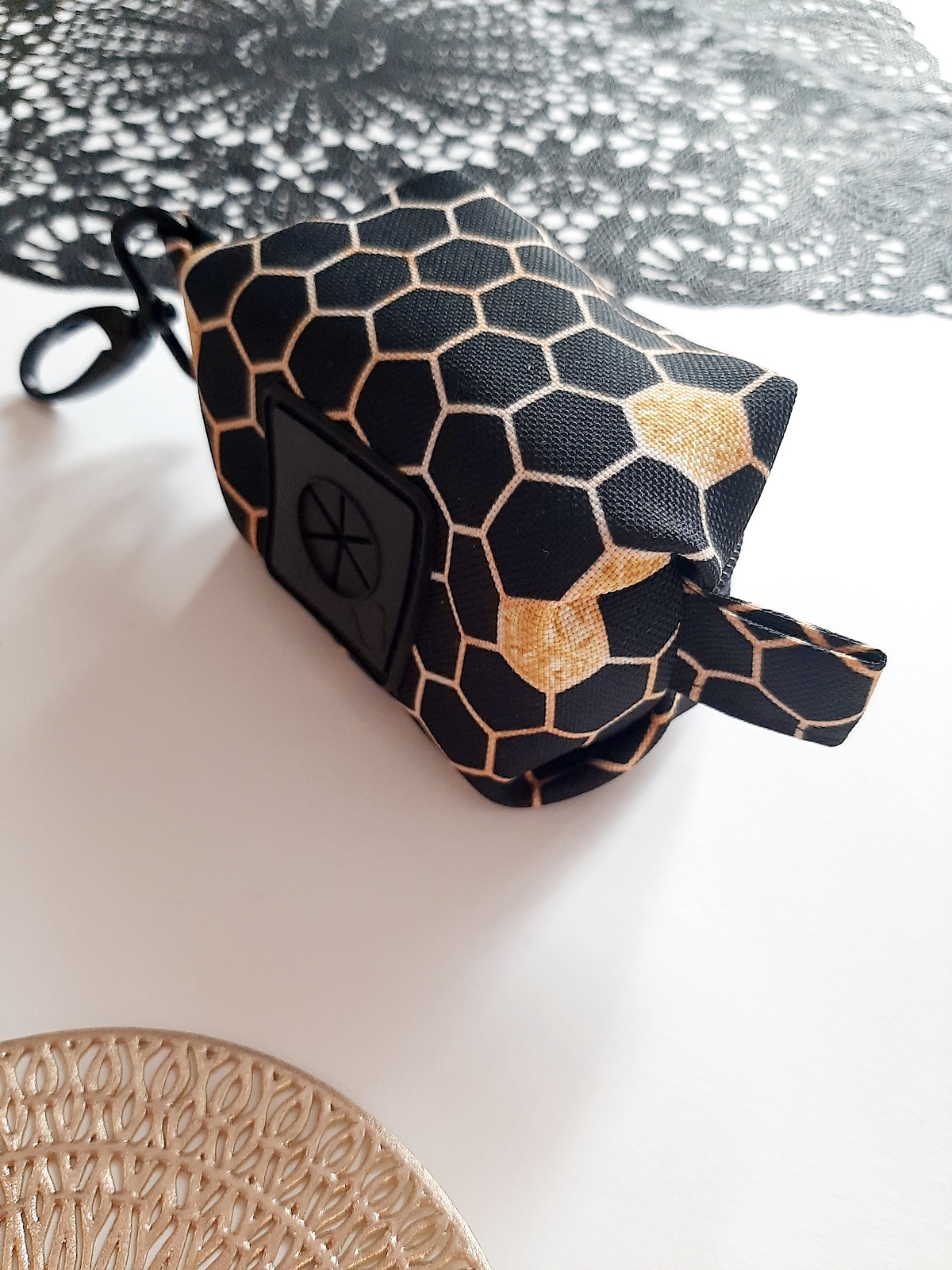 PSZCZOŁY Etui na kupoworki. Niewielkich rozmiarów etui na woreczki na psie odchody o bardzo ciekawym fasonie. Wykonany z wytrzymałych, wodoodpornych tkanin, dzięki czemu nie straszna mu żadna zła pogoda. Wnętrze jest w kolorze czarnym (wykonane również z tkaniny wodoodpornej). Całość zapinana się na zamek błyskawiczny.