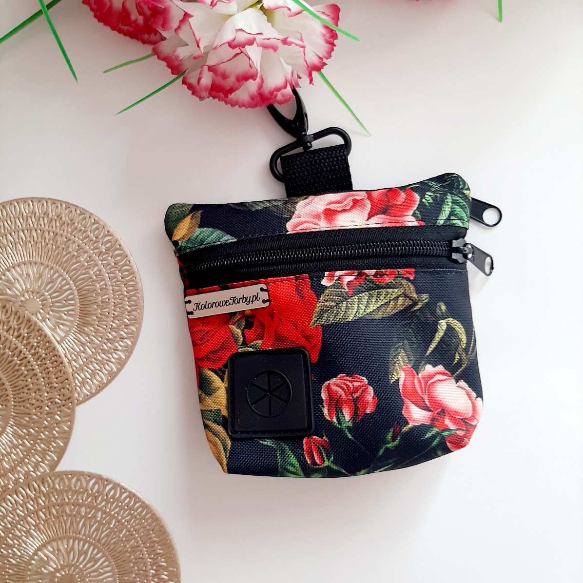 RÓŻE01 Saszetka 2w1. Praktyczna i funkcjonalna torebka 2w1 niezbędna podczas treningów czy spacerów. Z dwoma niezależnymi kieszeniami: jedną na smaczki, a drugą na worki na odchody. Wykonana z tkanin wodoodpornych, środek w kolorze czarnym. Z karabińczykiem do zamocowania np. przy spodniach.