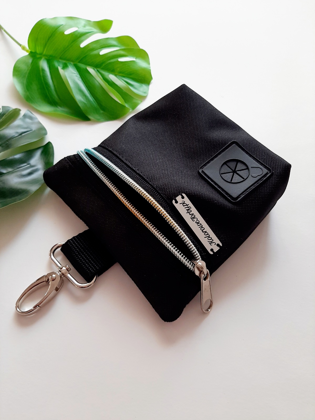 TĘCZOWY ZAMEK Saszetka 2w1. Praktyczna i funkcjonalna torebka treningowa niezbędna podczas treningów czy spacerów – nawet tych bardzo długich. Posiada dwie niezależne od siebie kieszenie: jedną na smaczki dla psa, a drugą na worki na odchody ze specjalnym otworkiem. Obie z zapięciem na zamki błyskawiczne.