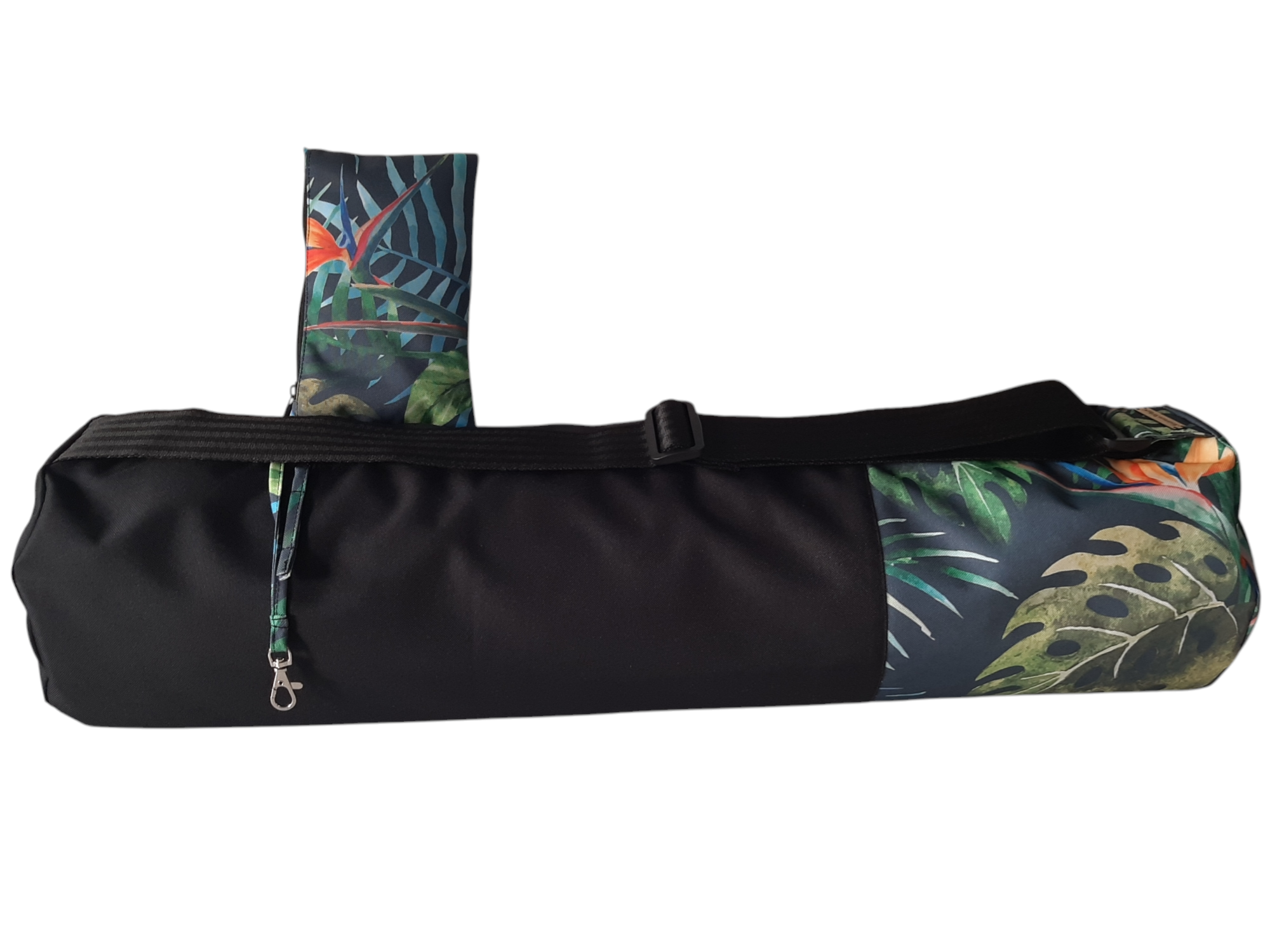 TROPIKI Torba na jogę wykonana z wytrzymałej, wodoodpornej tkaniny. Jej przykuwający wzrok print TROPIKI nie tylko zachwyca oko, ale także dodaje energii podczas praktyki jogi. Pokrowiec jest bardzo pojemny i funkcjonalny, dzięki czemu, oprócz maty zmieścisz tu ręcznik, kostki (w zależności od ich wielkości), strój, wodę, portfel. Jest tu miejsce również na różne drobiazgi, które schowasz w dopinanej kosmetyczce. Zdziwisz się jaka ta torba jest pakowna i ile się tu zmieści rzeczy. Dodatkowa wygoda to szeroki, regulowany pasek w kolorze czarnym. Dodatki, takie jak zamek i okucia, również są czarne.