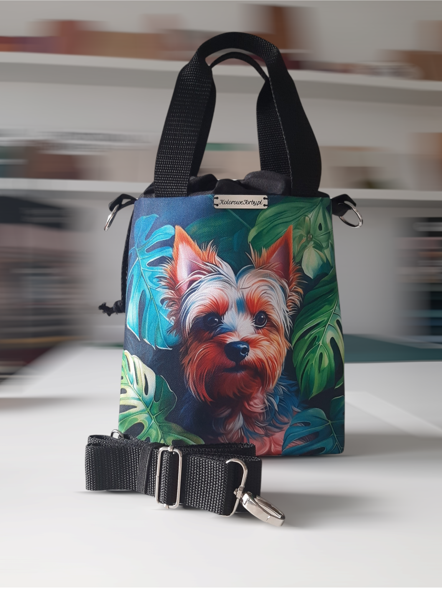 Przód torebki zdobi kolorowy panel z psem rasy York. Tył gładki jest w kolorze czarnym. W środku, na wodoodpornej podszewce, znajduje się duża kieszeń, zapinana na zamek błyskawiczny. Pomieści ona wszelkie drobiazgi.