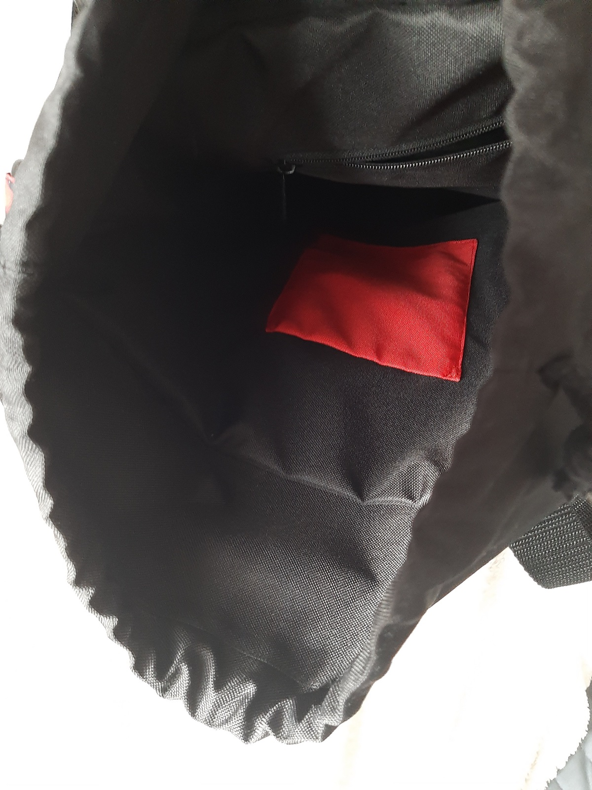 W środku, na czarnej i wodoodpornej podszewce, znajdują się dwie kieszenie. Jedna na zamek, druga otwarta np. na telefon. Torebka jest bardzo pojemna. Bez problemu pomieści rozmiar A4. Tył jest w kolorze czarnym.